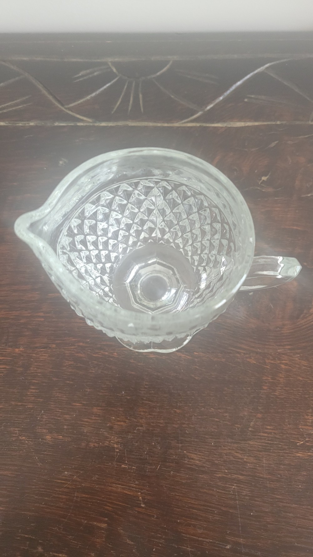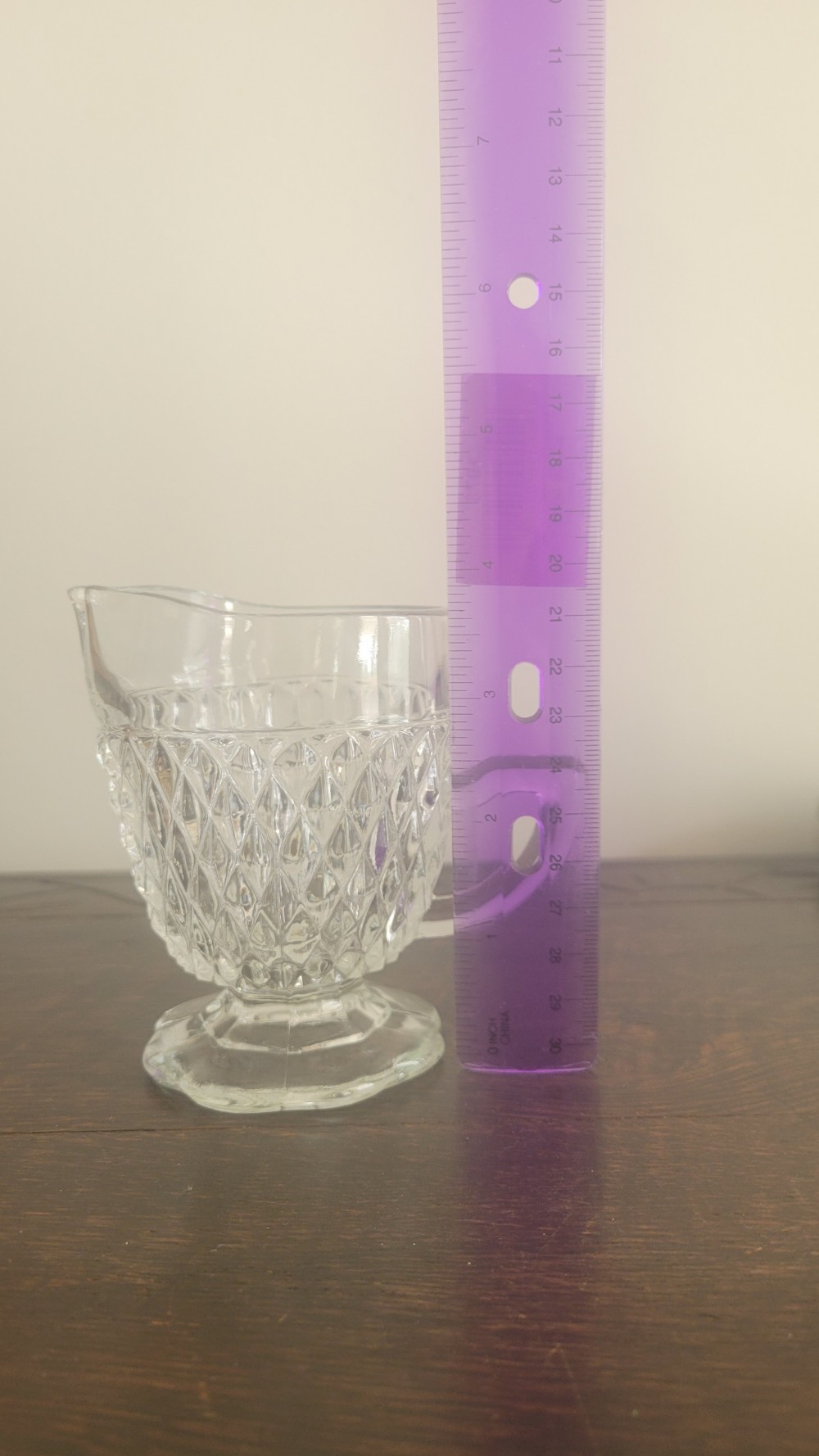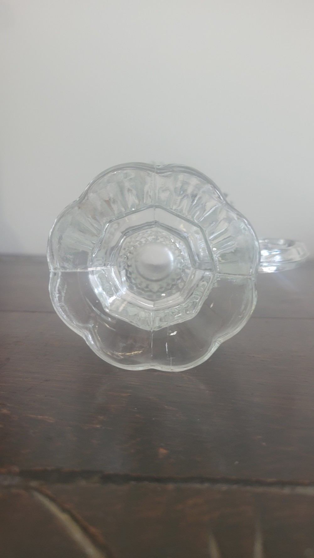 This item is a vintage Indiana Glass Diamond Point clear footed creamer. It has a footed base with a scalloped edge often described as flower-shaped.