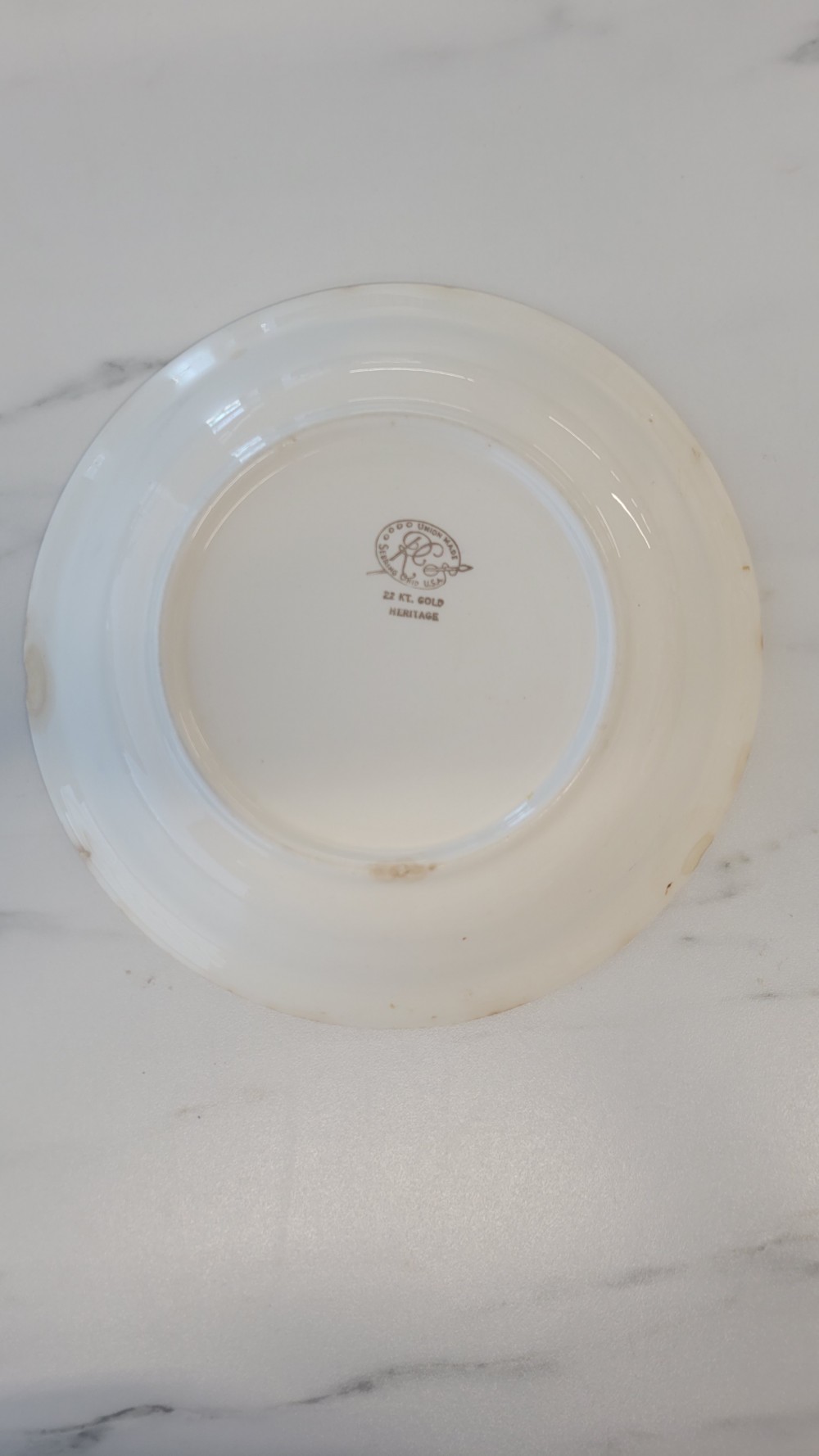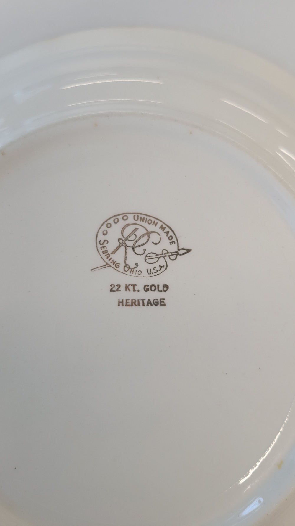 This item is a vintage vegetable bowl manufactured by the Royal China Company of Sebring, Ohio, featuring their "Heritage" pattern which includes a floral center and a 22-karat gold filigree rim.