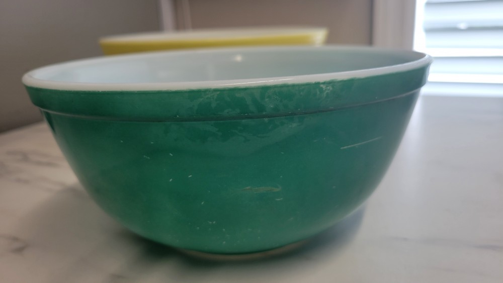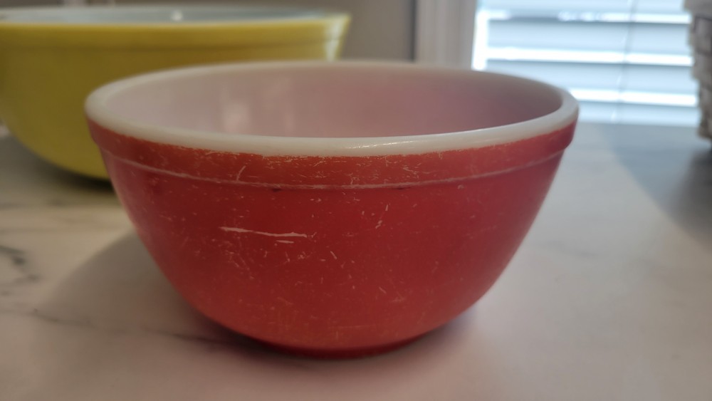 This item is a set of vintage Pyrex Primary Colors nesting mixing bowls, first manufactured in 1945.