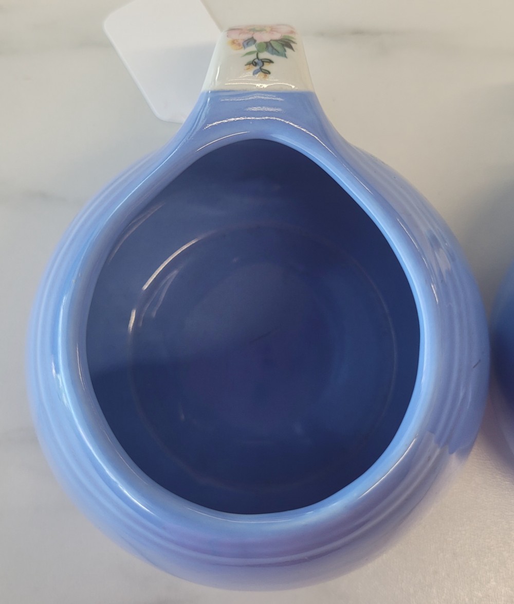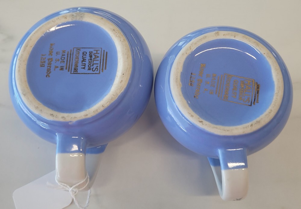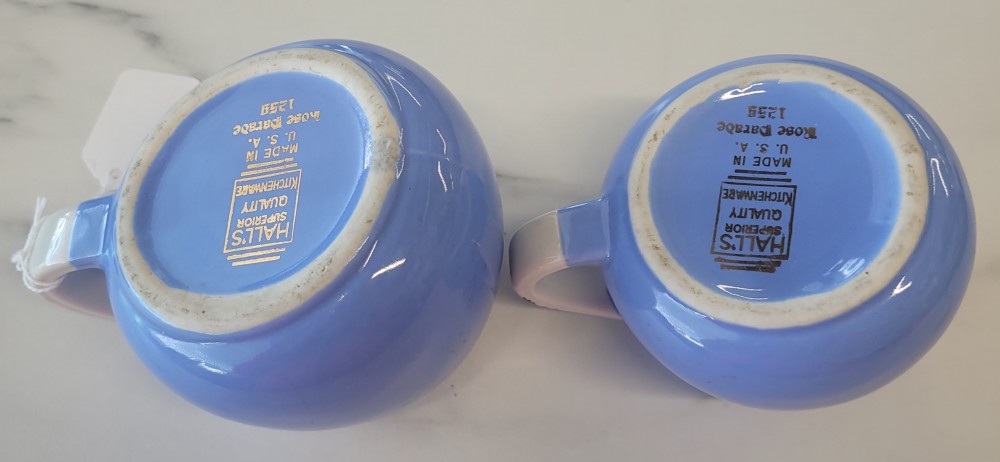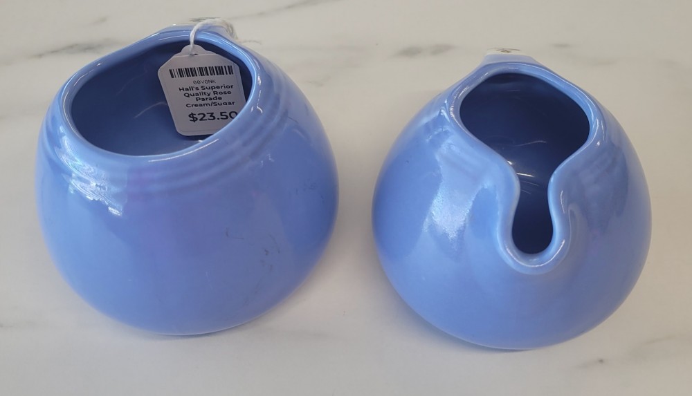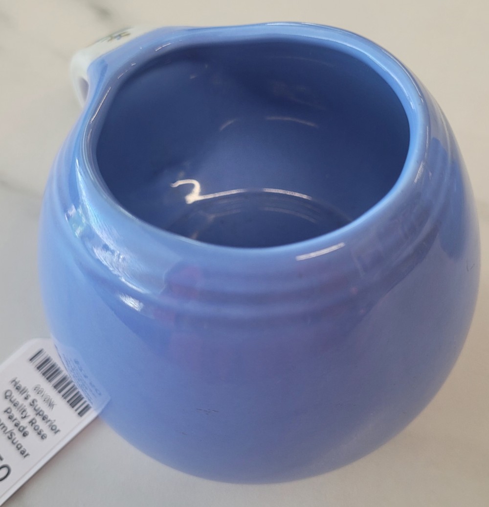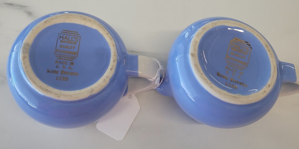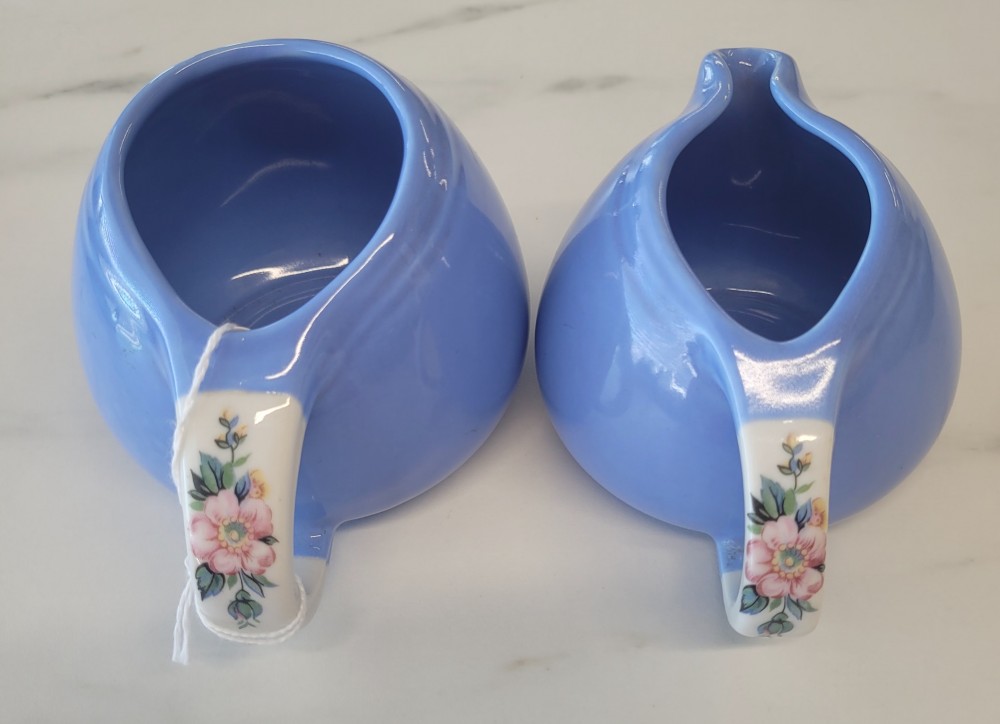1940s vintage Hall's Superior Quality cream and sugar in Rose Parade, 1259, periwinkle blue with white and floral. Excellent vintage condition with no chips, cracks, or crazing. Each piece is slightly smaller than 5 inches (including handle) wide by 3 inches tall.
