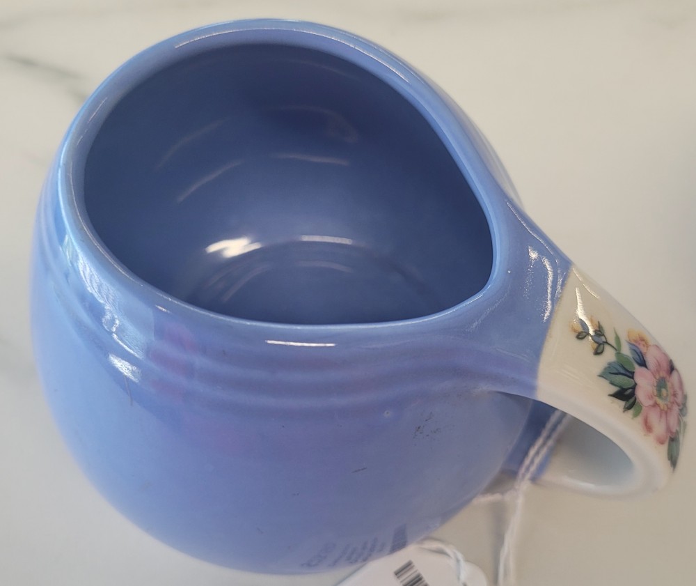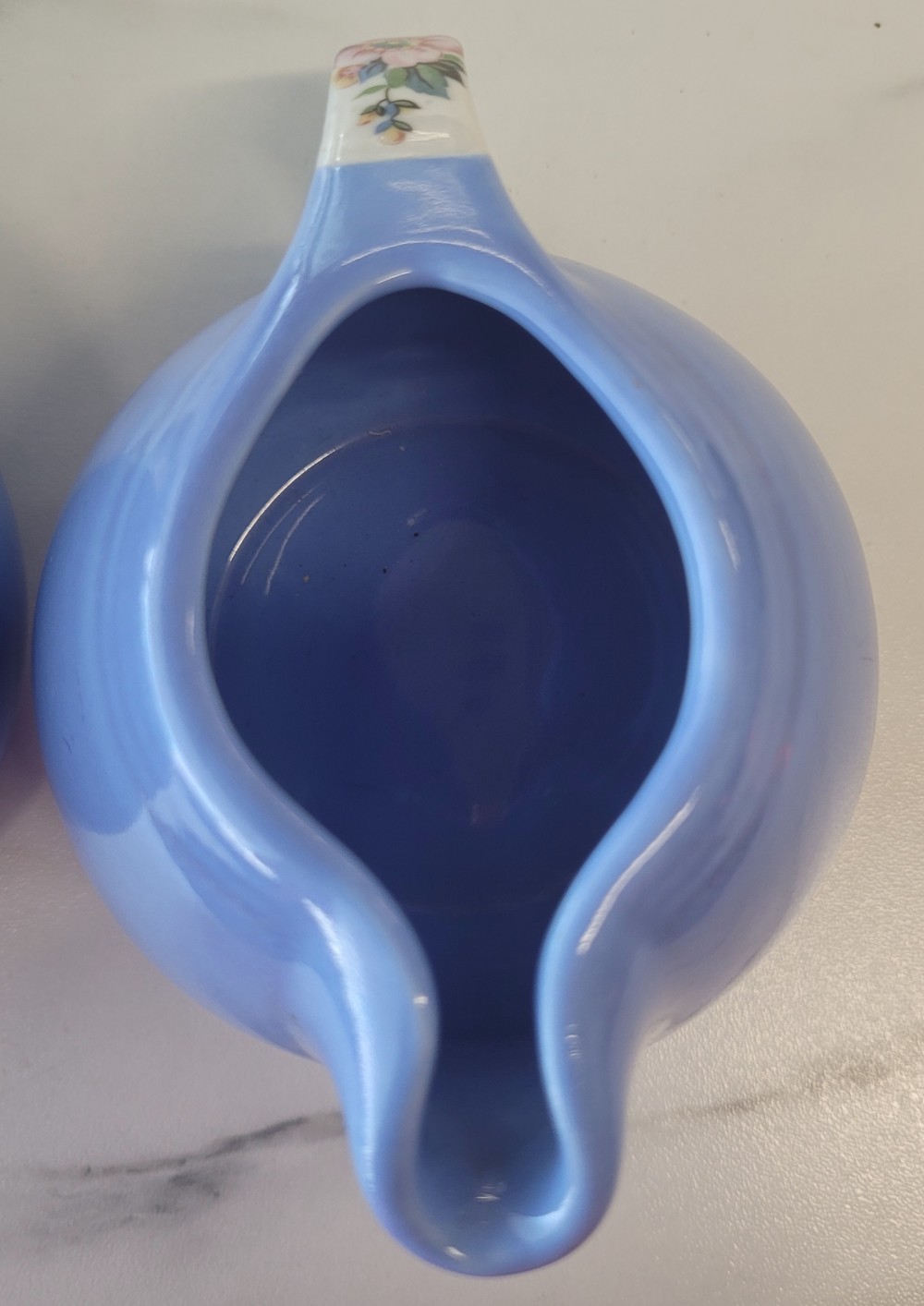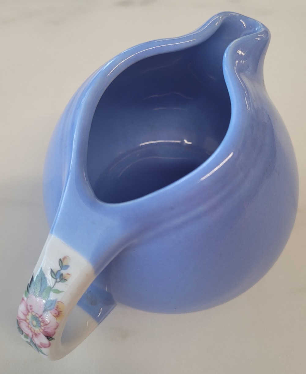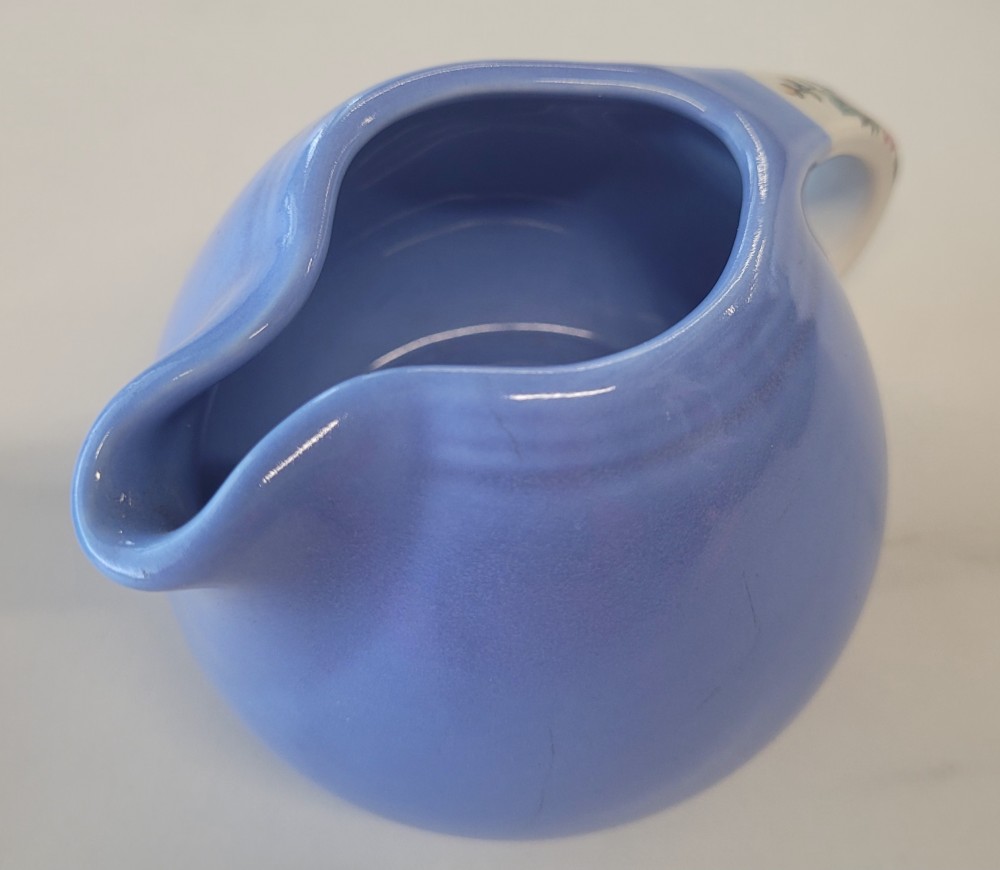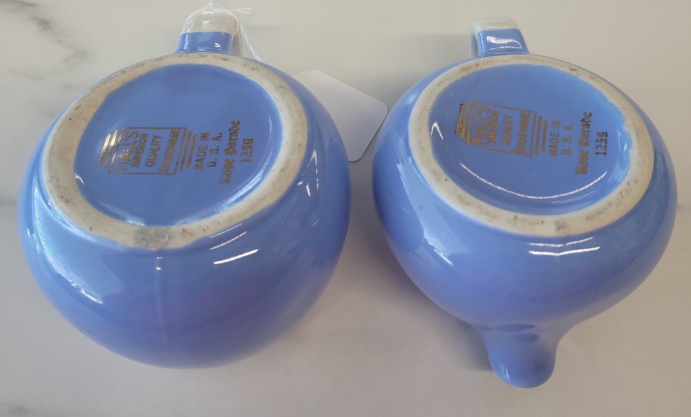 1940s vintage Hall's Superior Quality cream and sugar in Rose Parade, 1259, periwinkle blue with white and floral. Excellent vintage condition with no chips, cracks, or crazing. Each piece is slightly smaller than 5 inches (including handle) wide by 3 inches tall.
