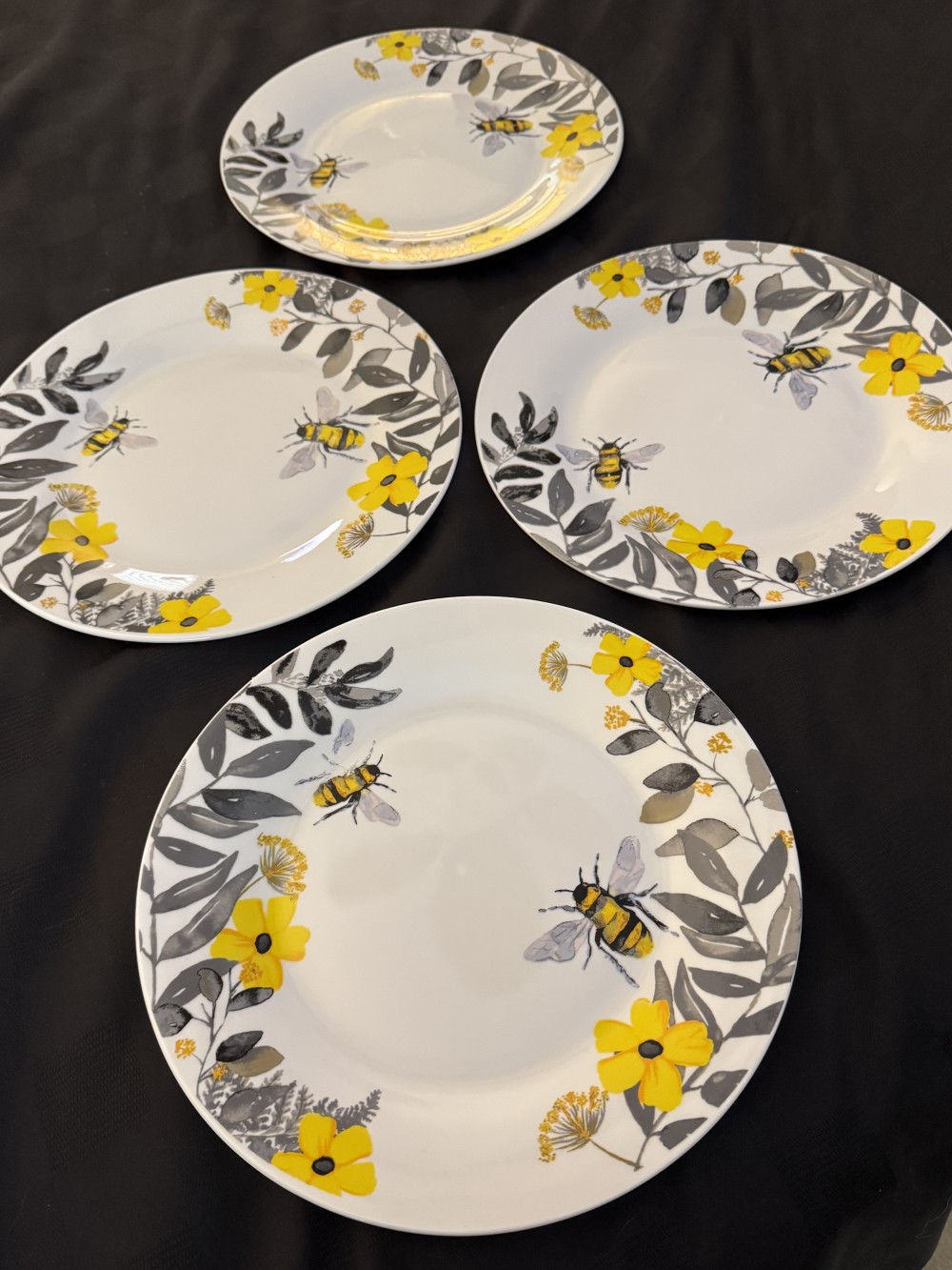 SET 4 DINNERV PLATES YELLOW/BLACK BUMBLE BEE PRINT, ROYAL NORFOLK