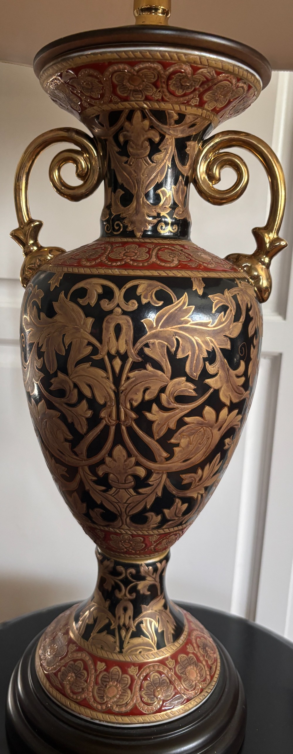 Vintage Bombay Co. Italian Style Rococo enamel gilded urn form table lamp. Black, red and gold leaf design urn with handles and taupe 8 side shade. 3-way socket and 6 foot cord.