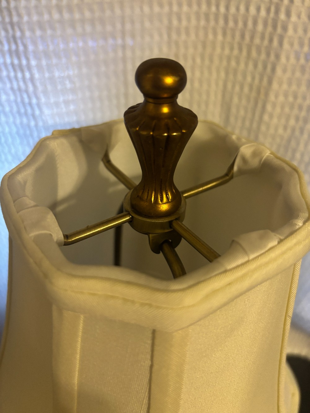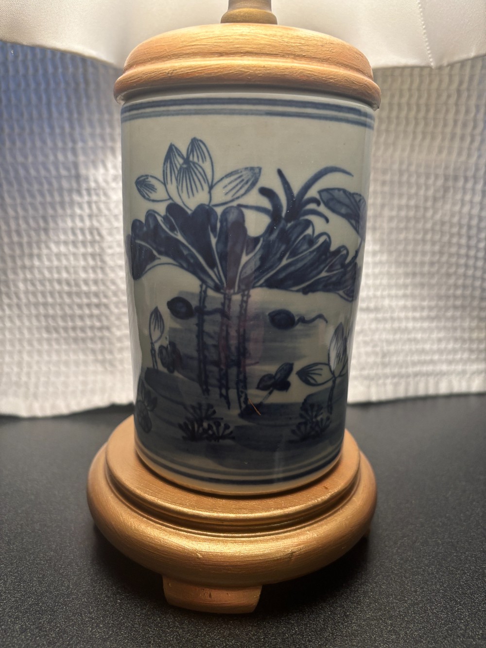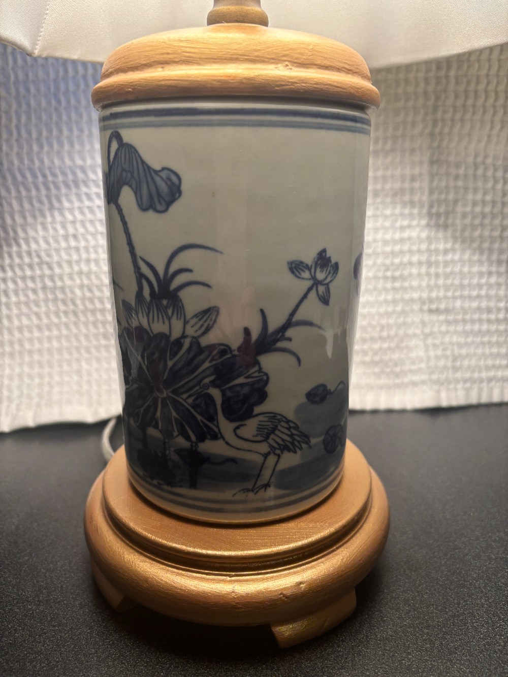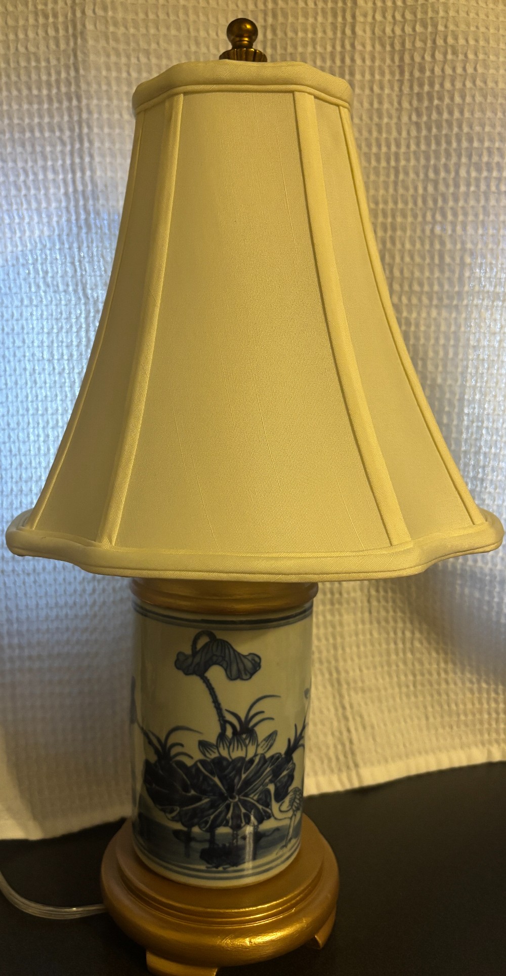 Blue and white porcelain 1 way lamp with a painted gold wooden base and ivory shade. EUC, it's a beauty.