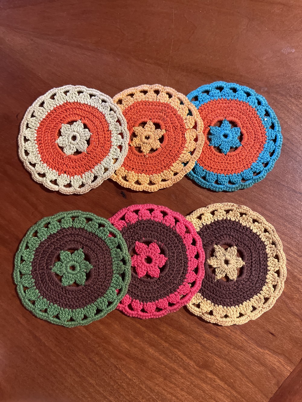 Set of 6 vintage MCM hand-crocheted coasters, in bright retro colors. Very well made with tight stitches, in very good condition with no holes or loose strings. 3.5” in diameter.
