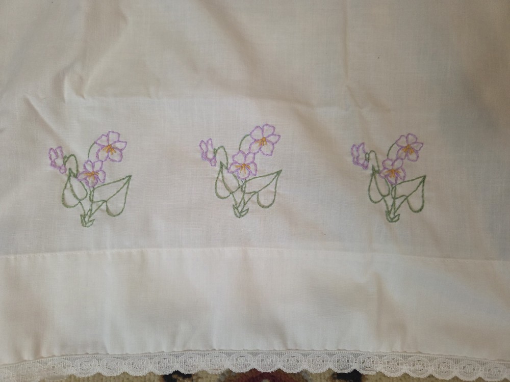 Pair of vintage white pillow cases embroidered with purple flowers. Standard size.