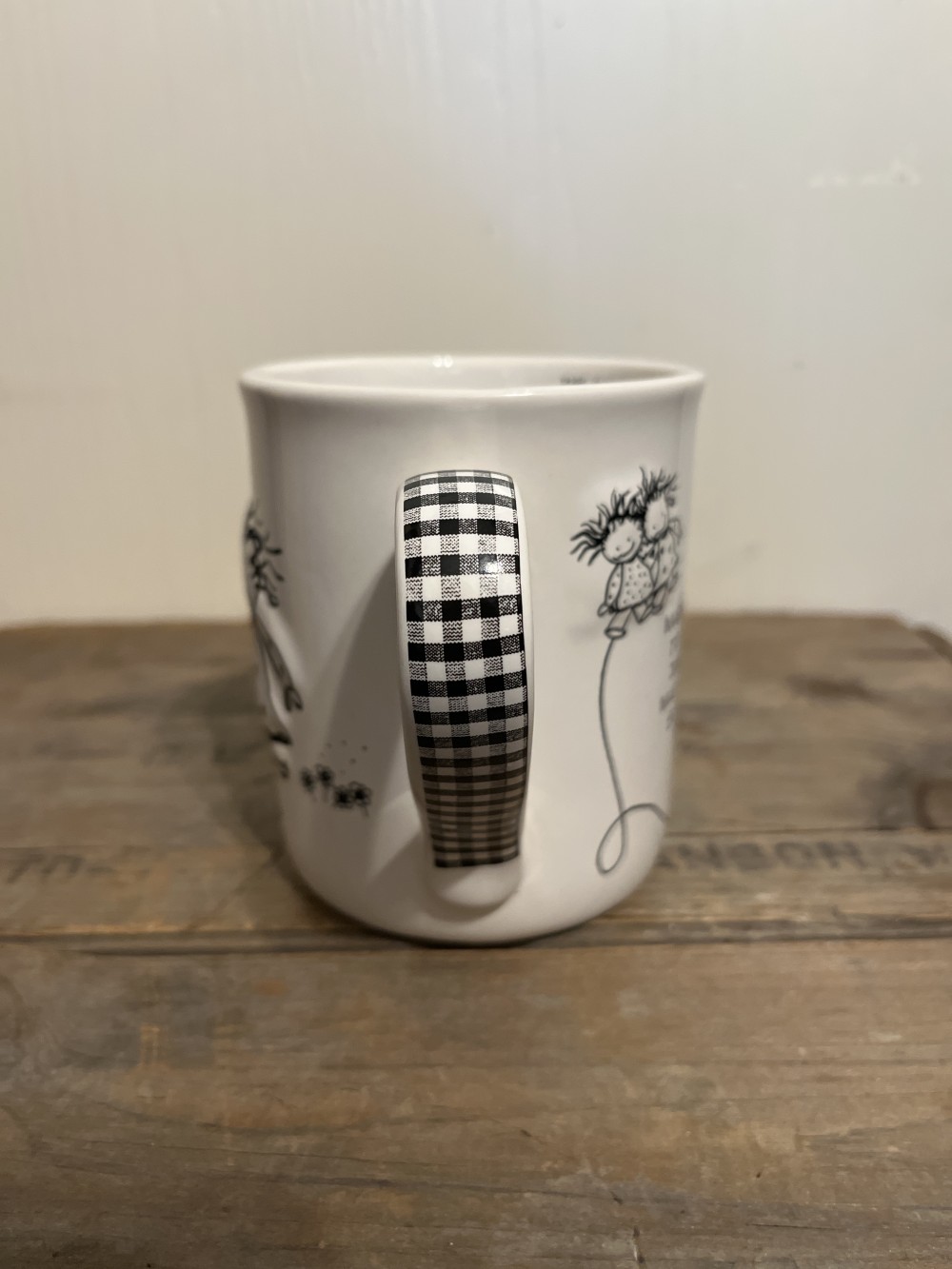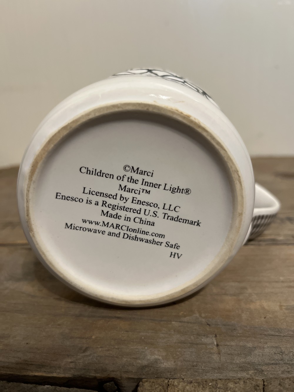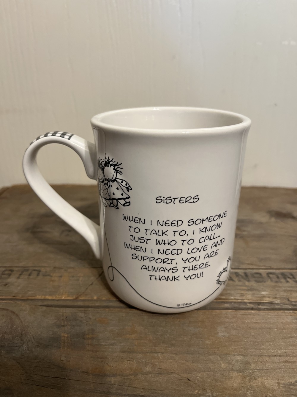 Enesco Marci - Children of the Inner Light series “Sisters” mug. This item features embossed hand-drawn little girls, walking arm and arm on one side, an adorable Sisters poem with embossed girls and heart on the opposite side, and the sentiment: “The bonds we have are everlasting,” on the inside rim. Mug is preowned, in excellent condition with no damage, hold 16 ounces.