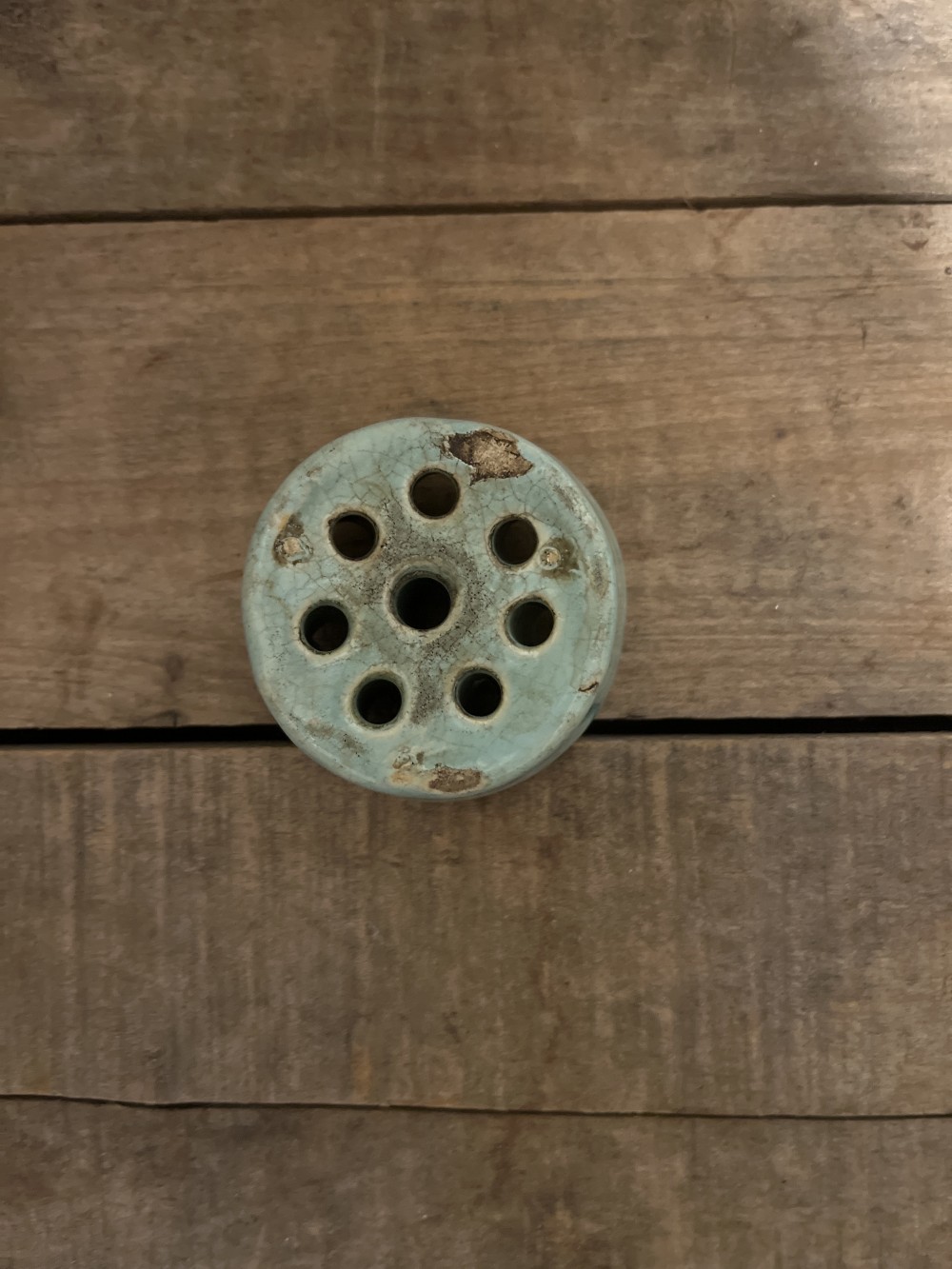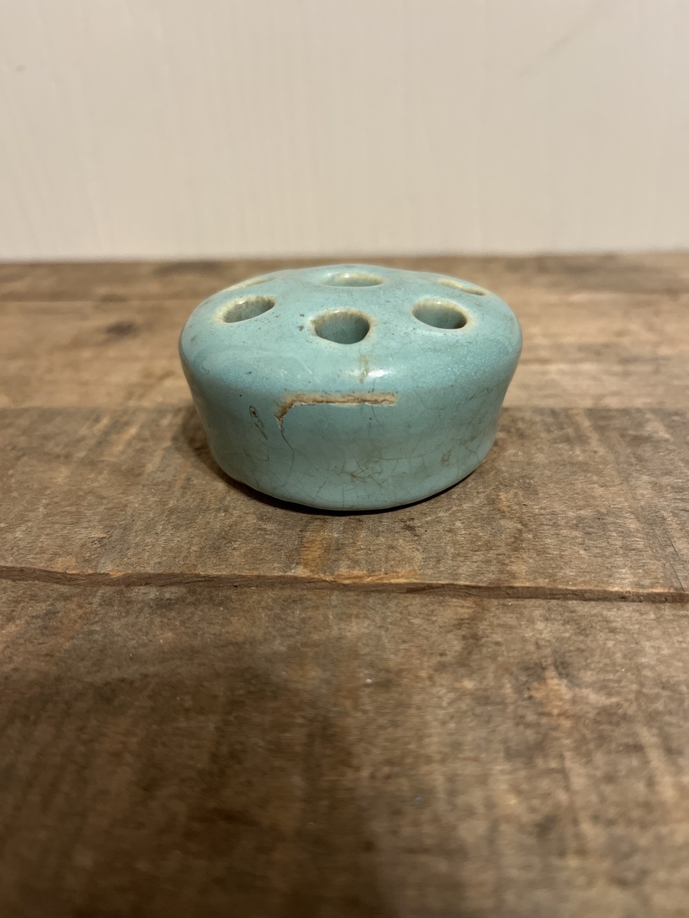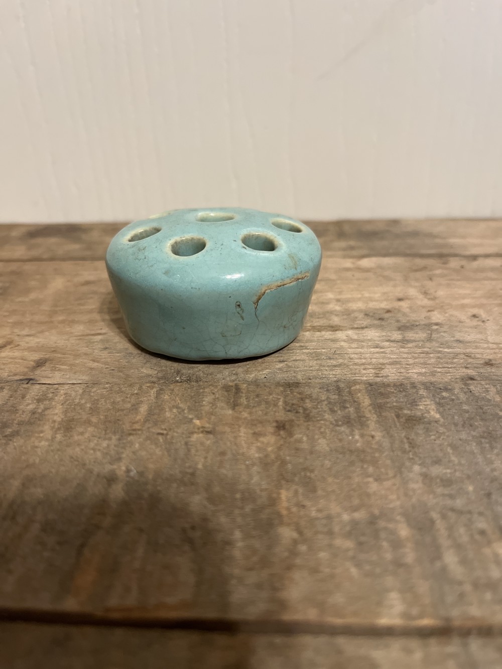 Antique 1920s turquoise blue 8 hole Weller Pottery flower frog. Good condition for age, with signs of wear, crazing, and a small crack on one side that does not go all the way through. Still a beautiful and rare find!