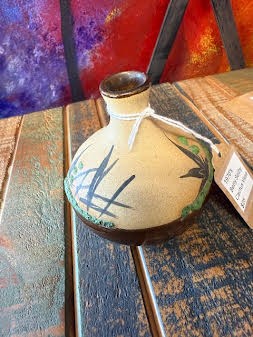 4" pottery vase signed Betty Selby. It is from the 1970's. It has a raised dimentional 3D desert design with cactus and plants. It is signed Betty Selby on the bottom.