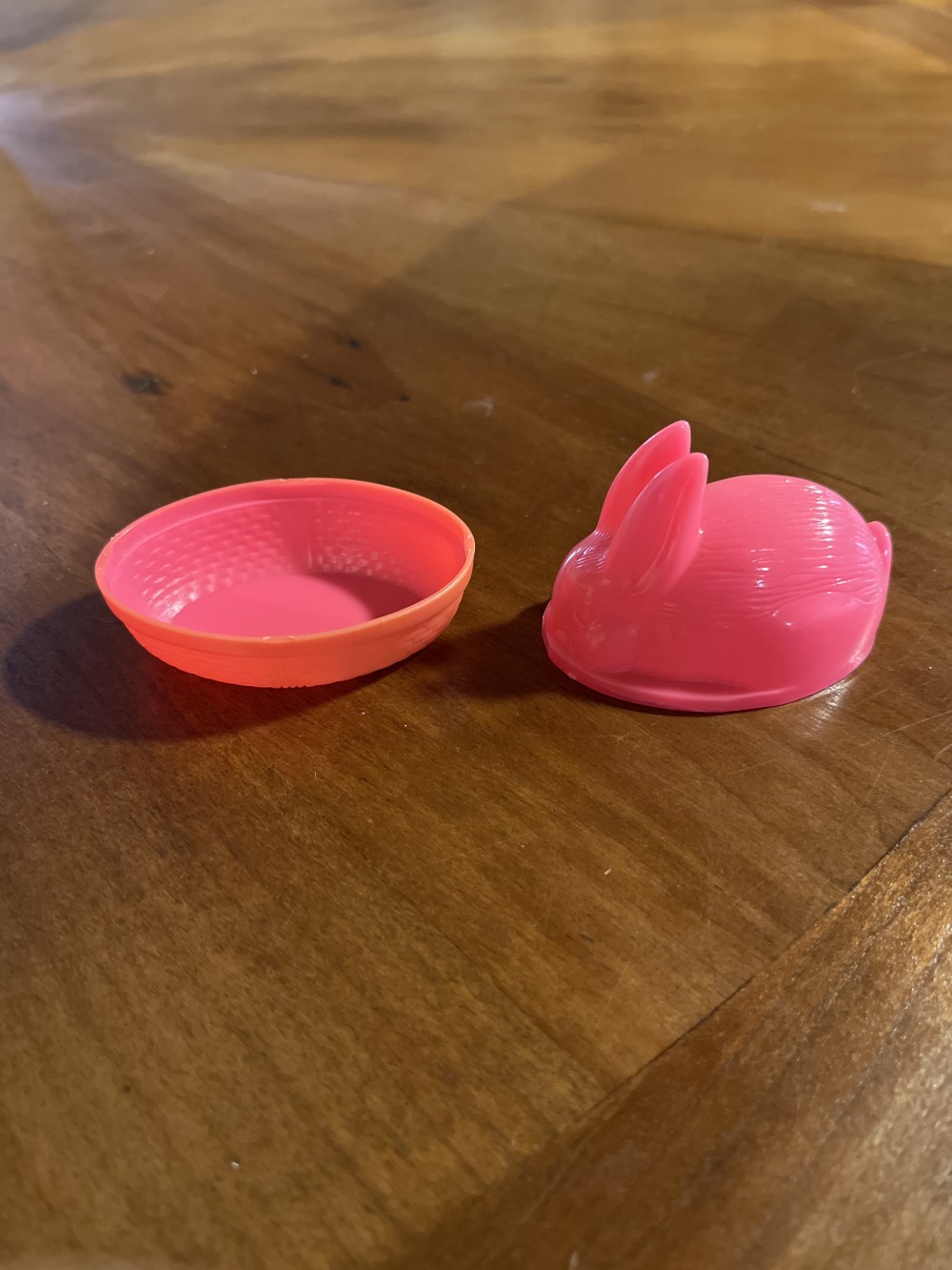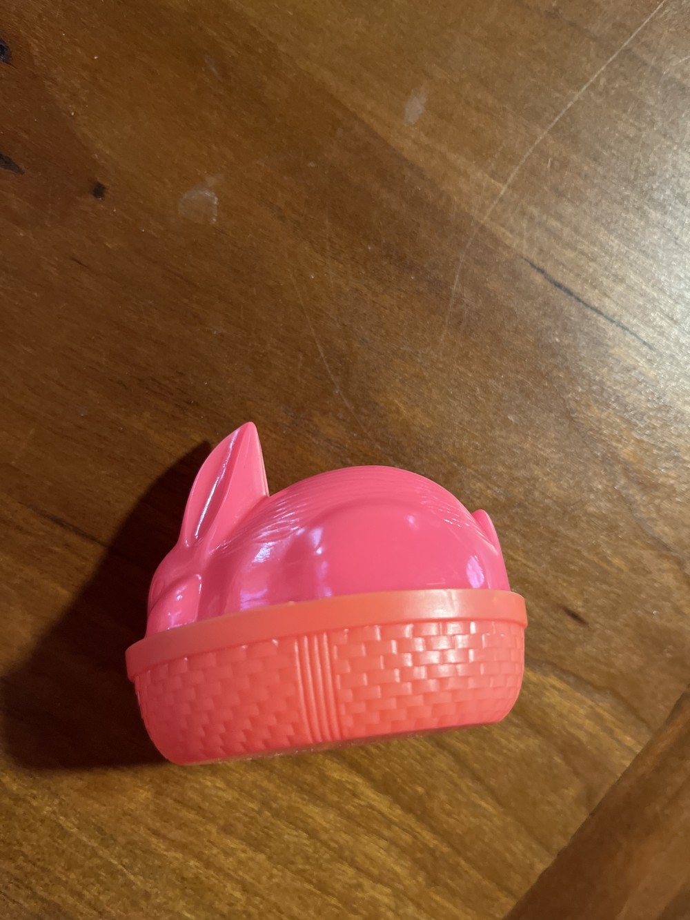 Vintage MCM Rosen pink plastic bunny candy container, likely made in Hong Kong. Measures approximately 2.25” tall x 2.5” long in very good vintage condition with no cracks, slight difference in color between bunny and basket. A great little nostalgic piece to add to your Spring/Easter decor!