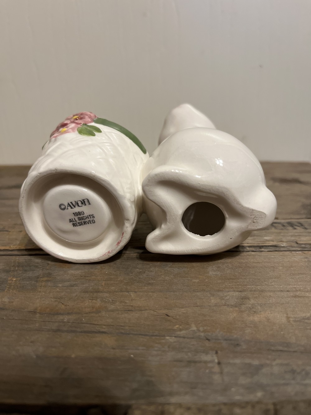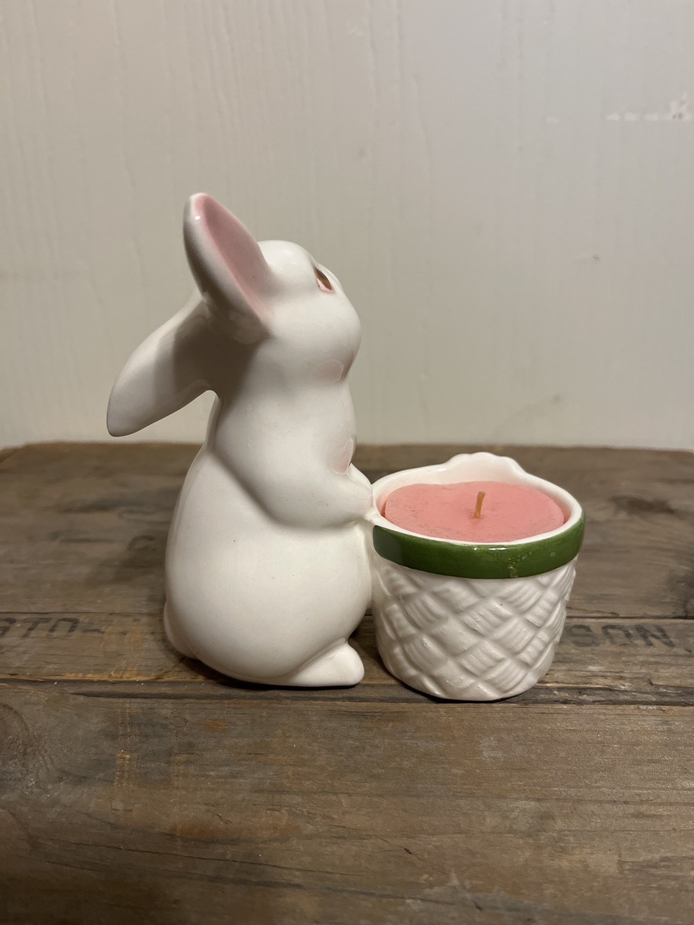 Vintage 1980 Avon ceramic bunny votive holder, made in Brazil by Weiss. This cute bunny is holding a basket with a pink candle and stands approximately 5 inches tall. This item is preowned in very good condition with no damage. This was part of a collection which introduced a new piece each year.