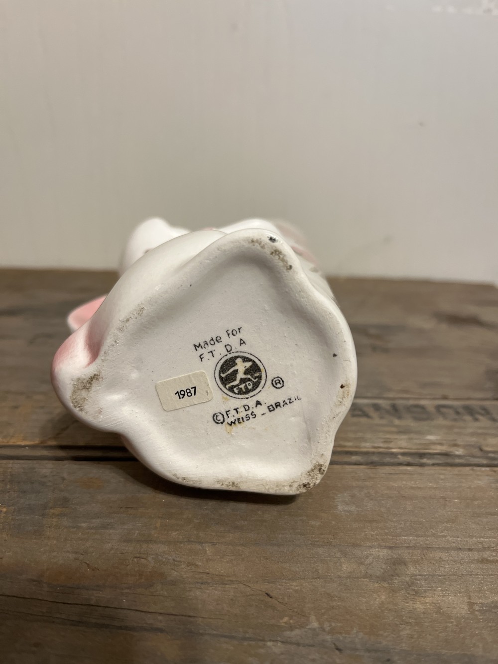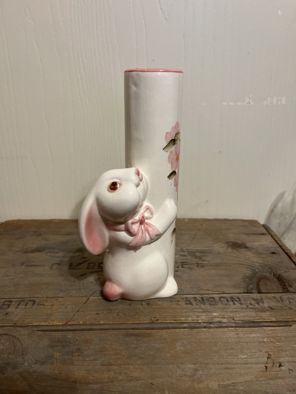 Vintage 1987 FTD ceramic bunny bud vase made in Brazil by Weiss. This adorable vase was hand painted and coordinates with the Avon bunny collection from the same era. This item is preowned and in very good condition with no damage. Measures 7.5 inches tall.