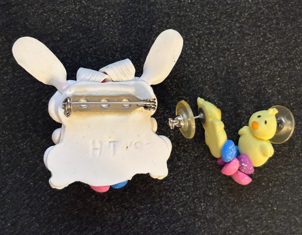 Easter clay white bunnies and chicks with eggs pin and earrings set.2" x 2"