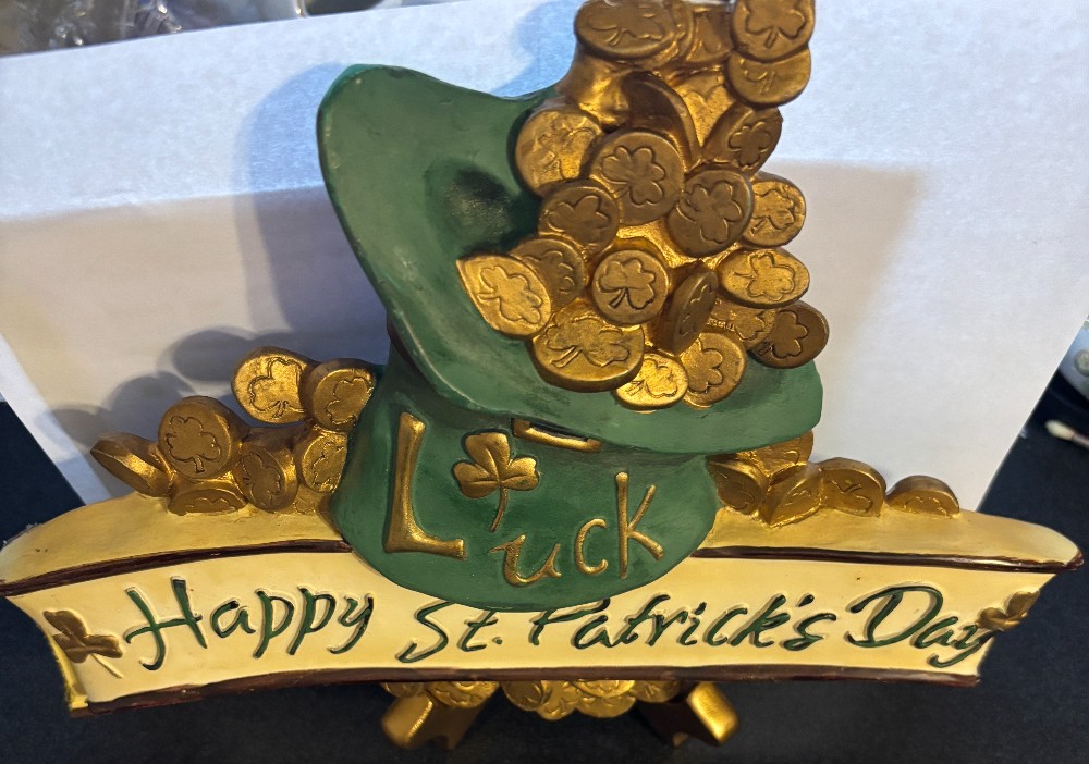 Happy St. Patrick's Day hanging decor green hat with coins. Hard plastic.8.5"T X 11"W