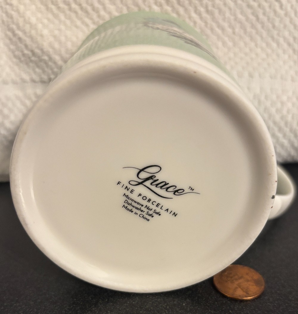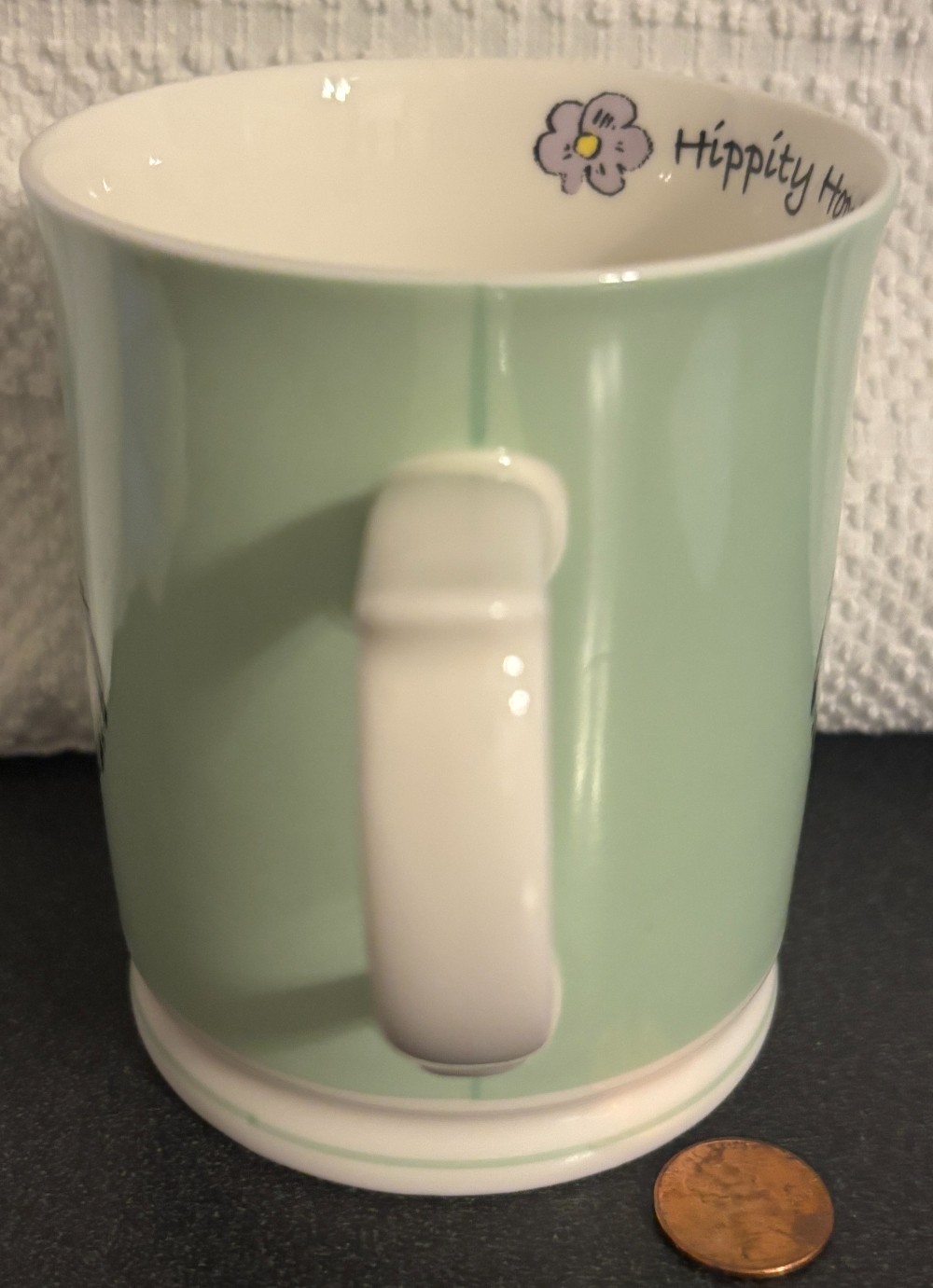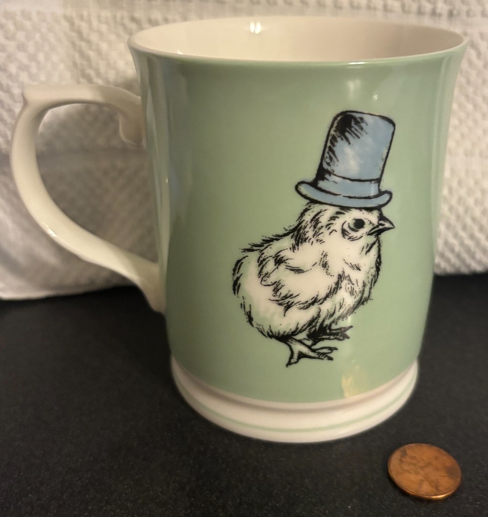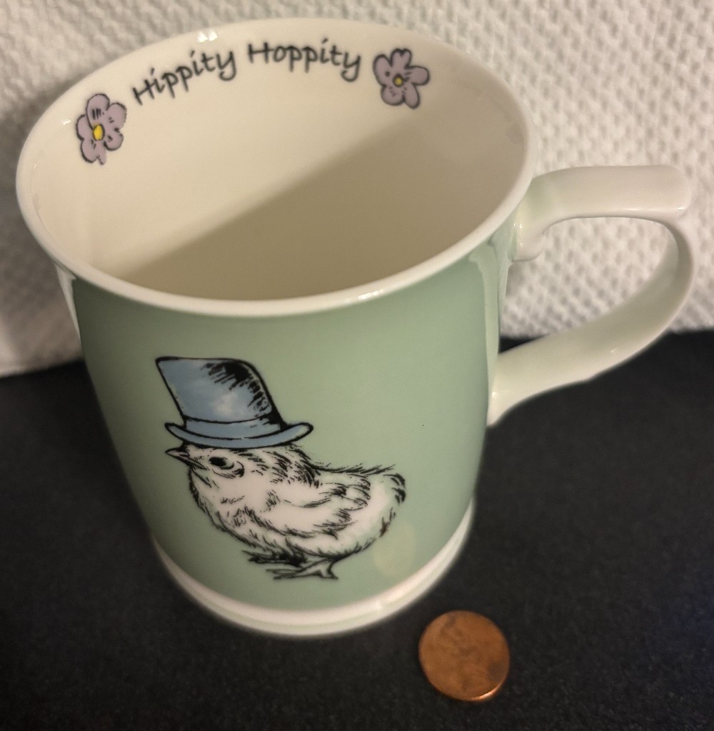 Easter sage green chick with blue top hat mug EUC "Hippity Hoppity" fine porcelain. Grace.