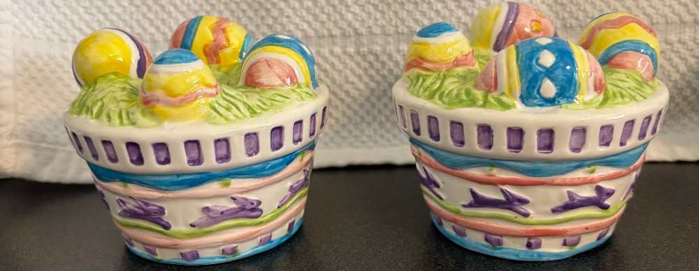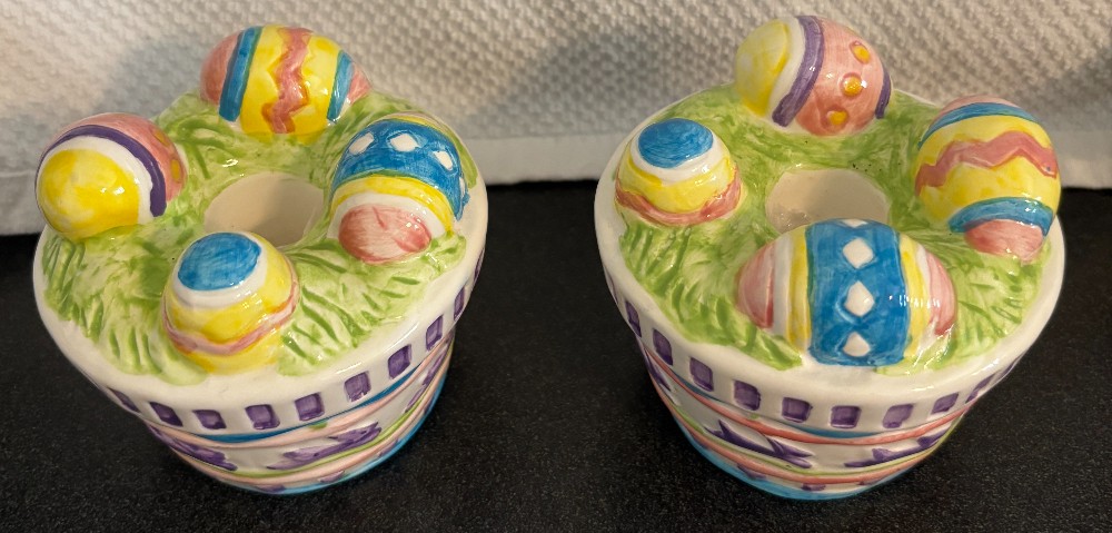 Pair of vintage American Greetings "Forget Me Not" ceramic Easter egg basket candle holders.
