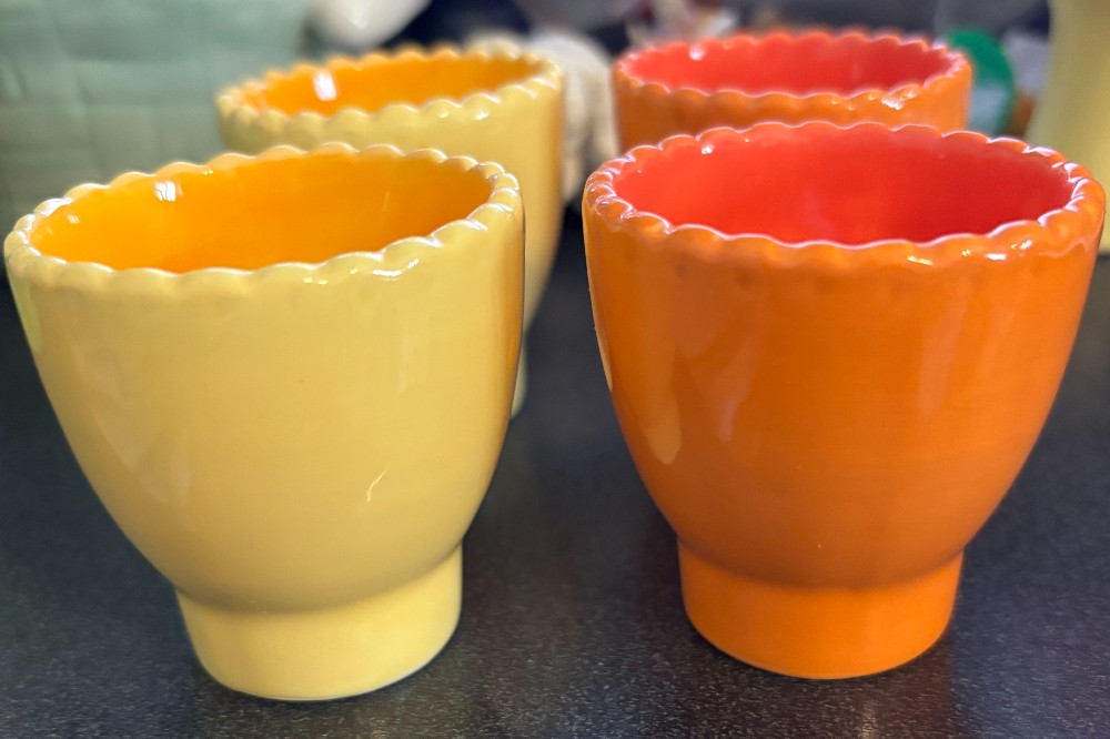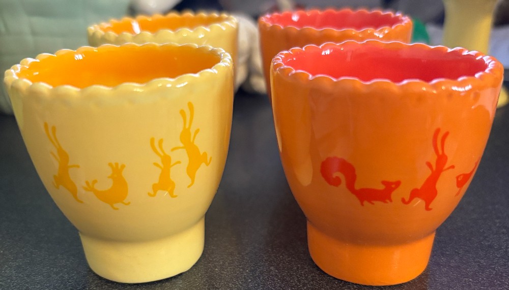 Set of 6 World Market egg cups 4 yellow and 2 orange. Bunnies and chicken on yellow and squirrel, bunny and chicken on orange.
