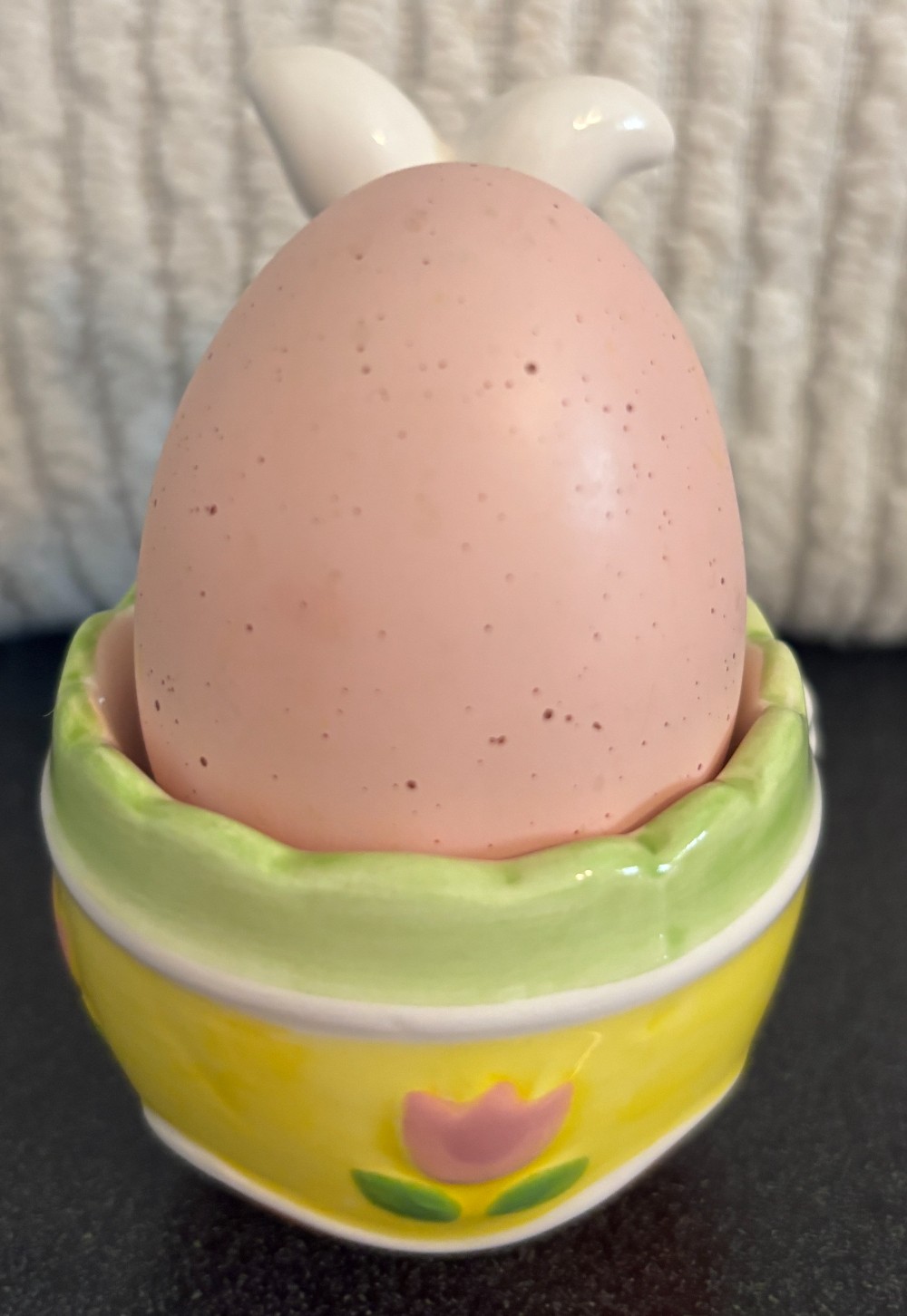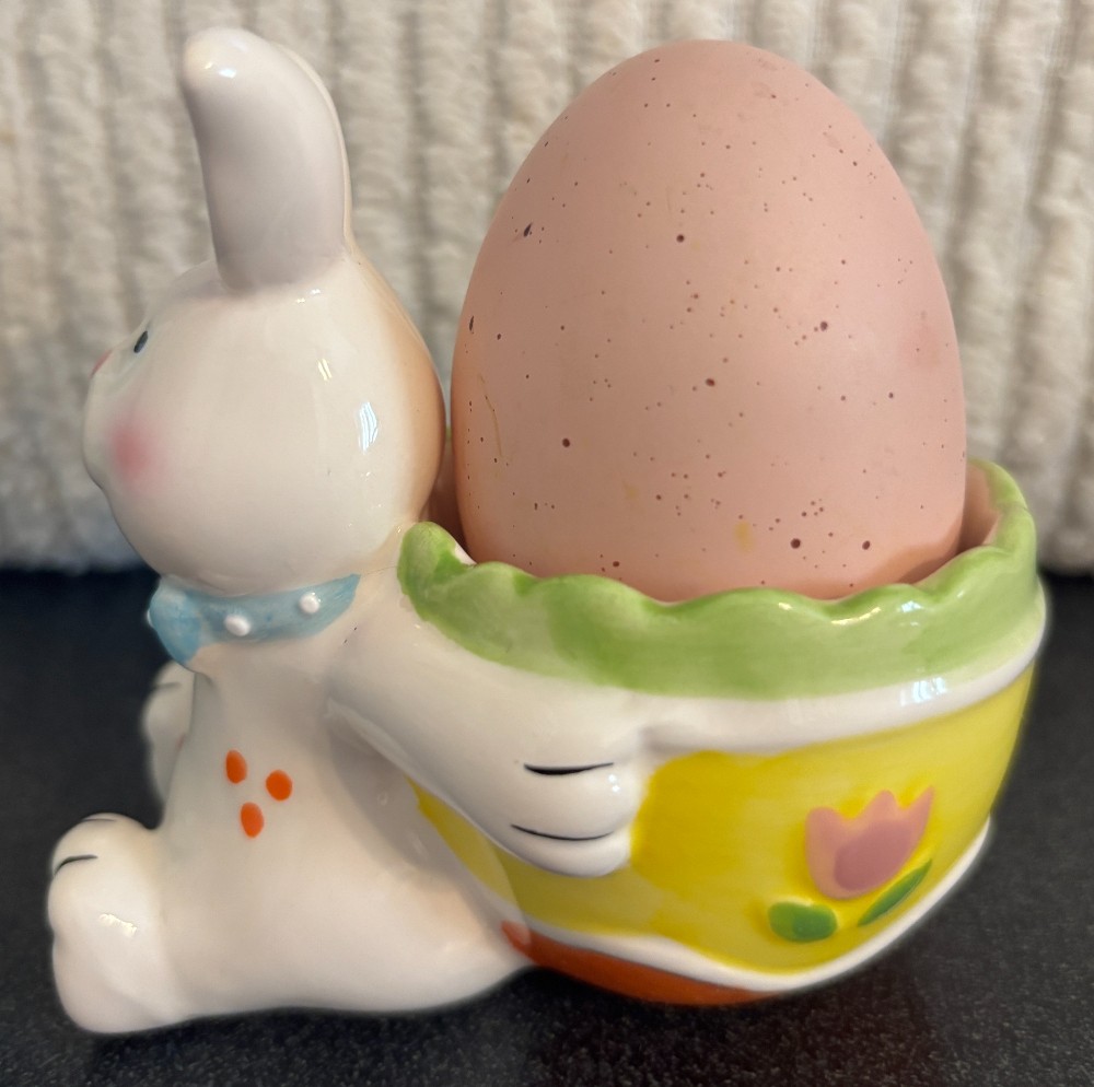 White ceramic Easter bunny blue bow tie egg cup stripe tulips with pink resin egg.