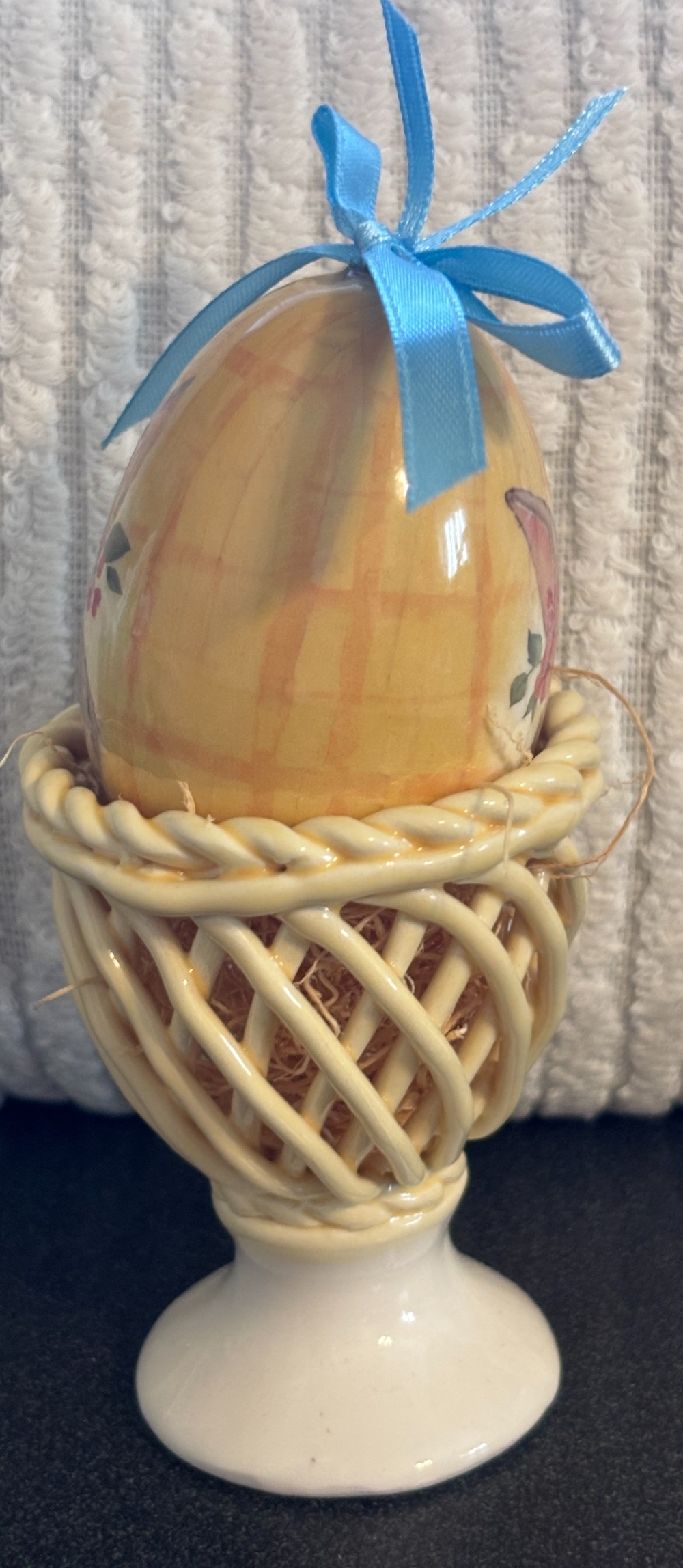 Ceramic white and yellow woven egg cup with tan bunny egg in straw.5.25"T x 3"WSet of 2