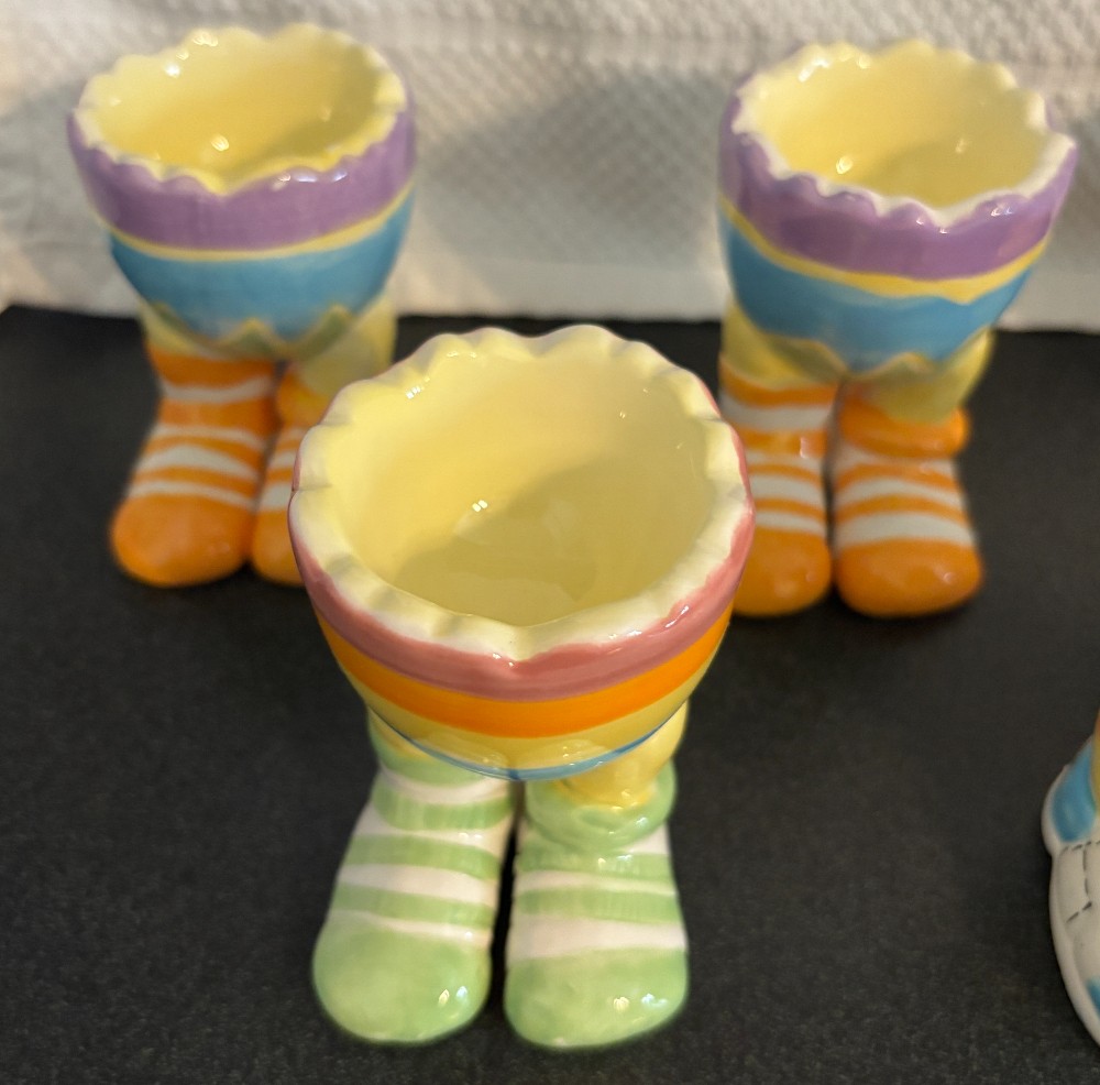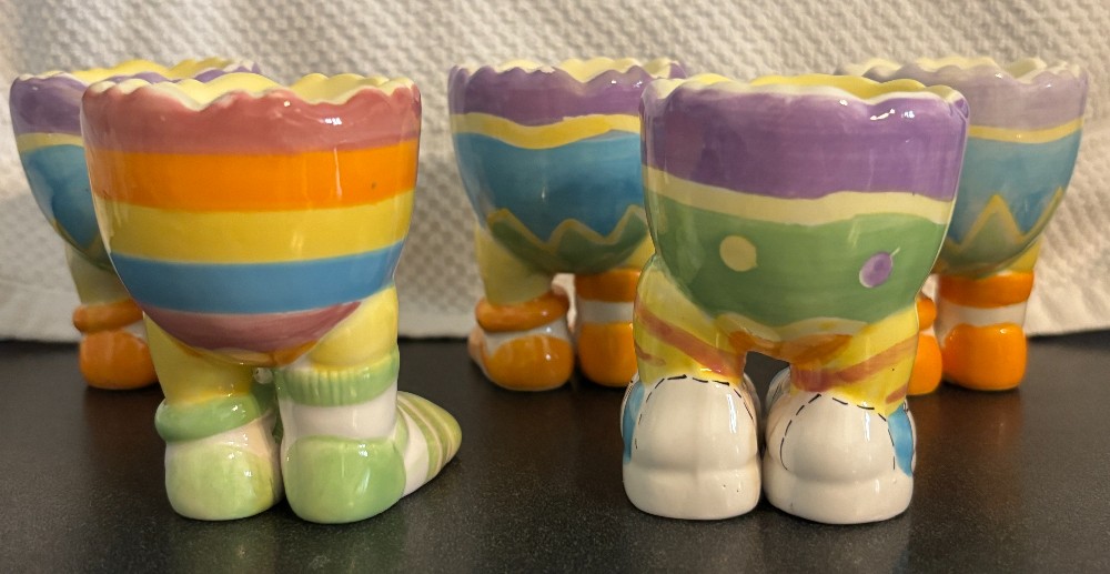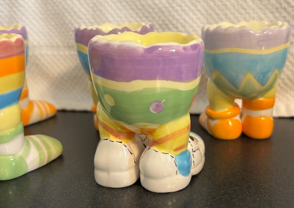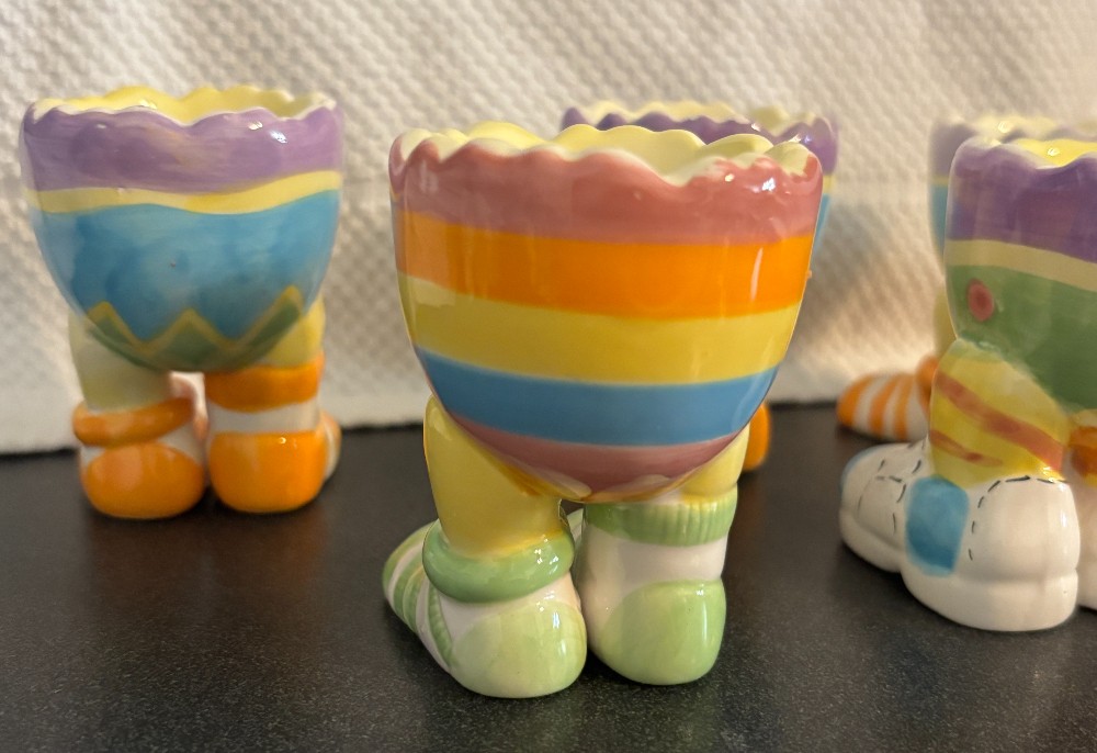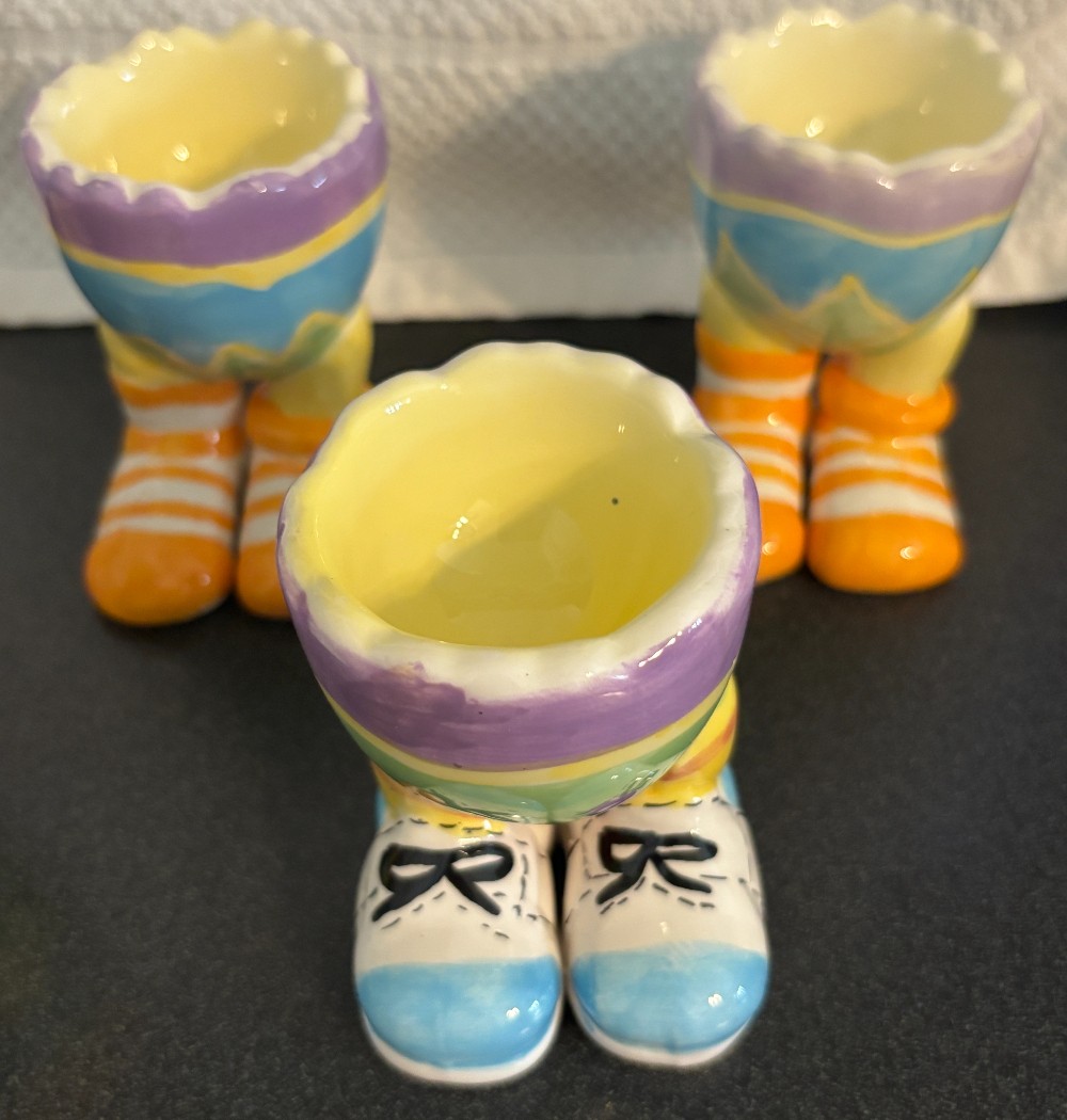 Set of 5 Easter decorated ceramic egg cups striped socks & a tennis shoe.3"T x 2.25W