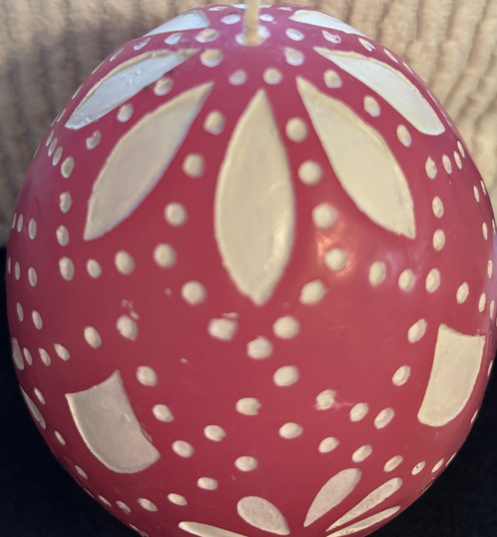 Pottery Barn Easter egg candle pink w/white carvings.6.5"T x 5.5"W