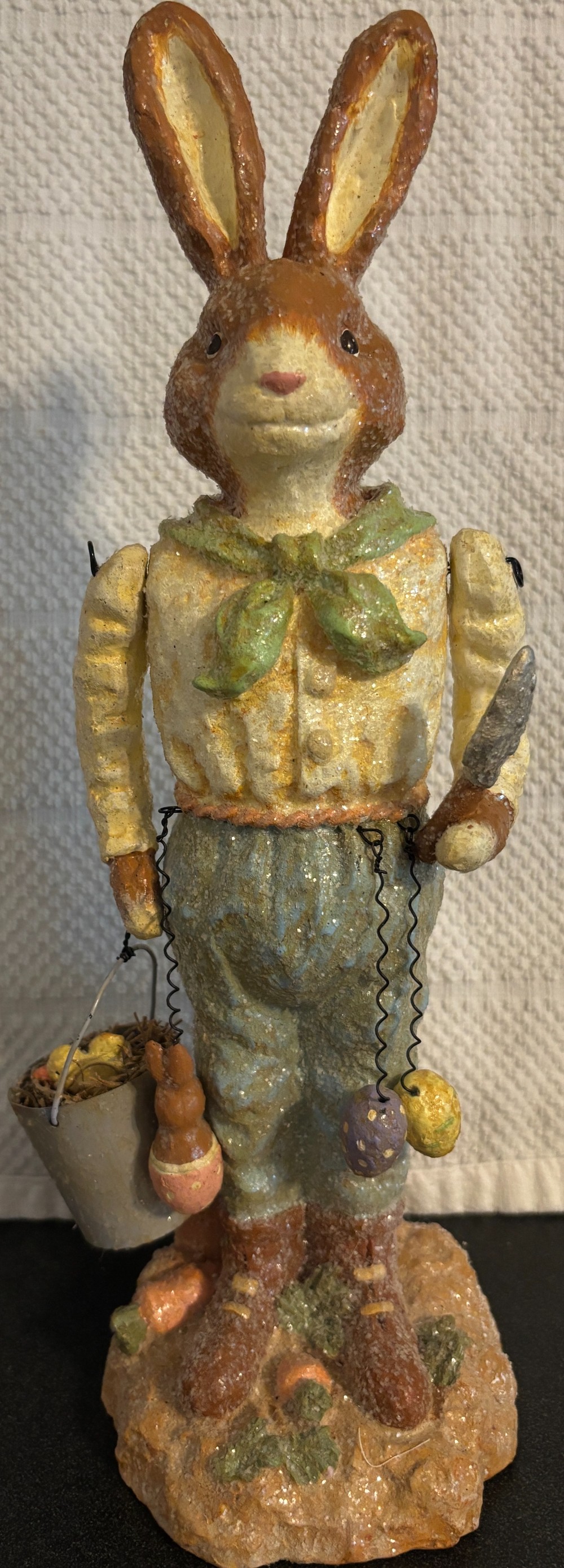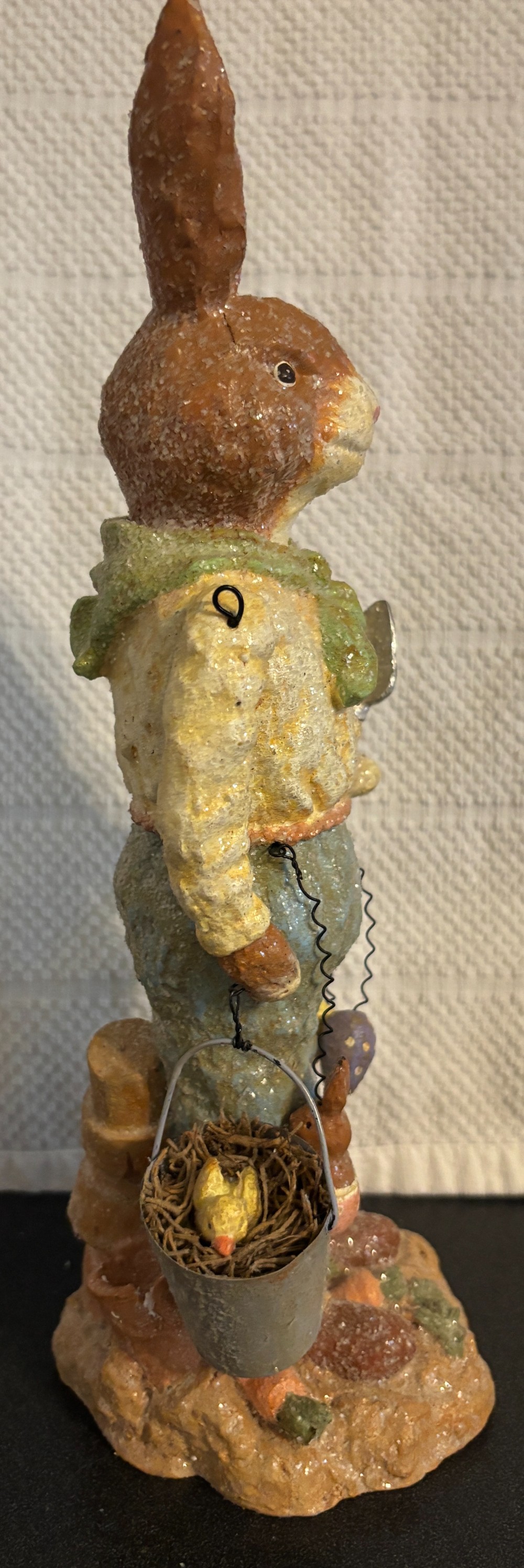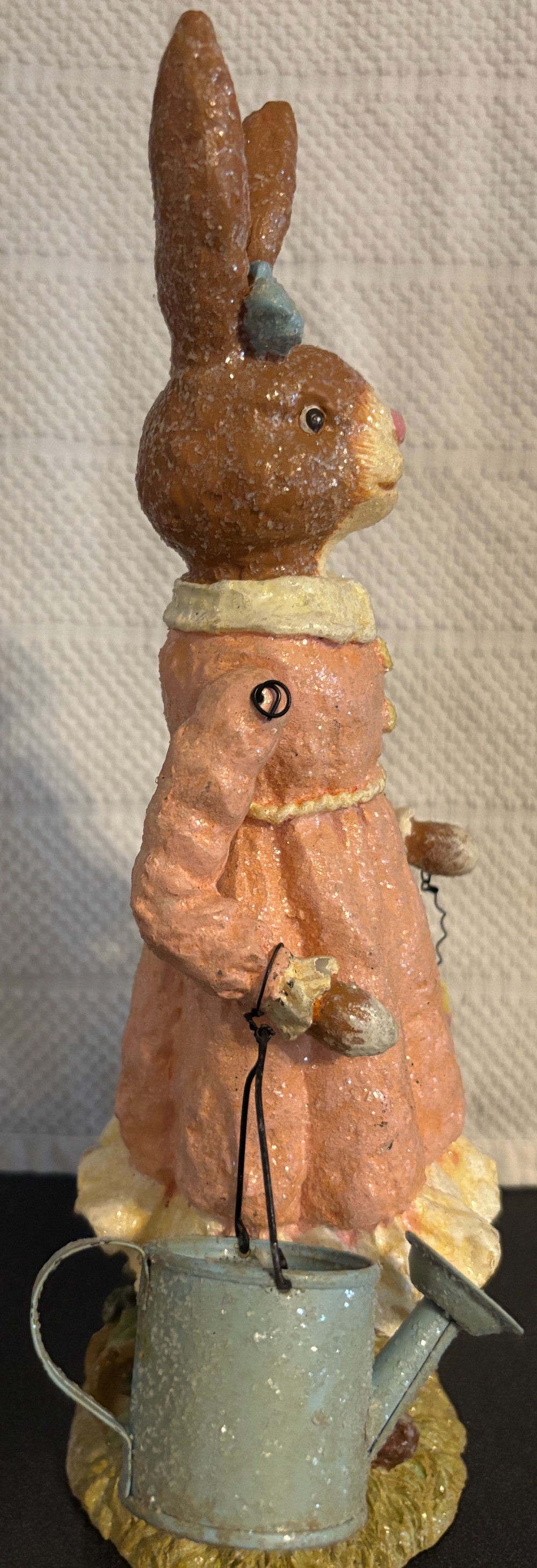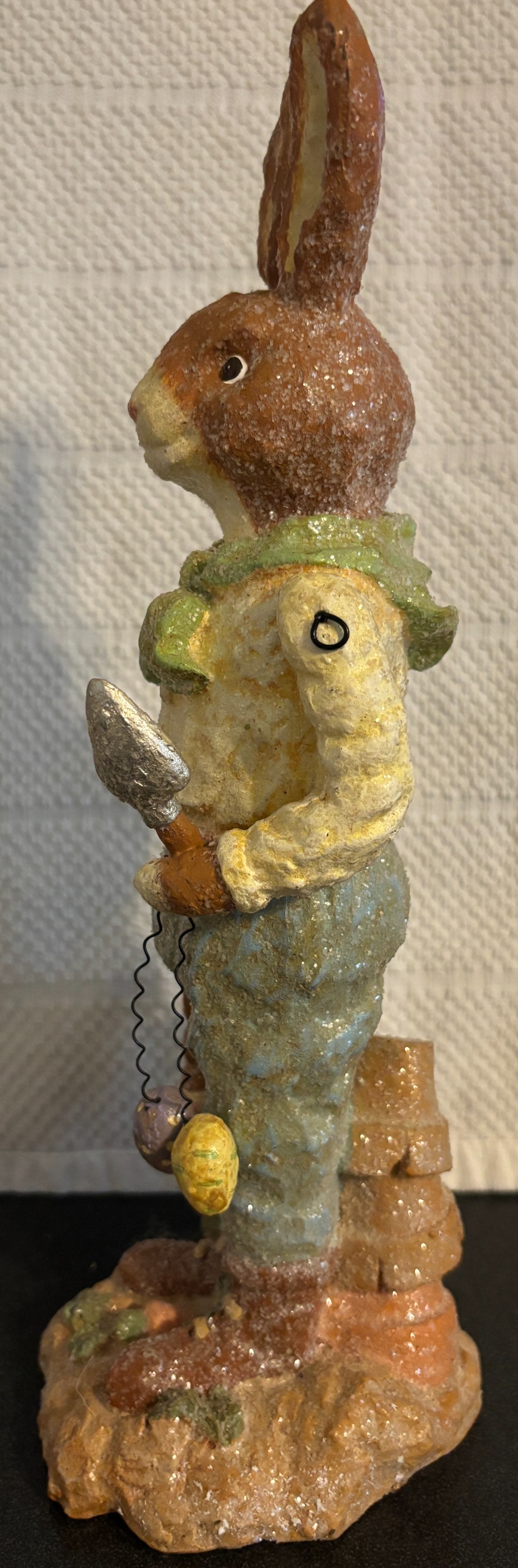 Set of 2 Easter resin with glitter tan and white gardening rabbits with moveable arms 2003, EUC