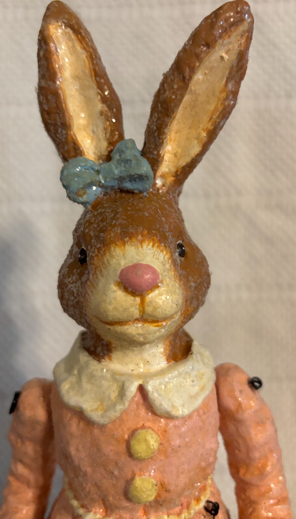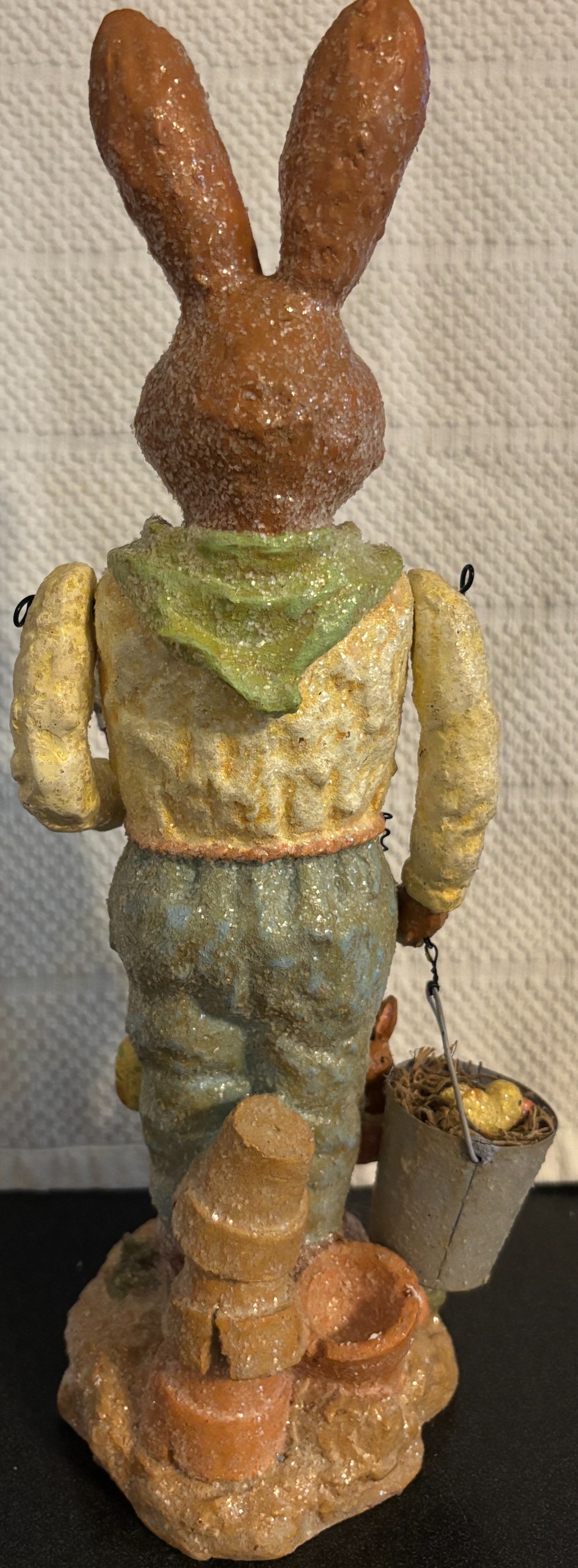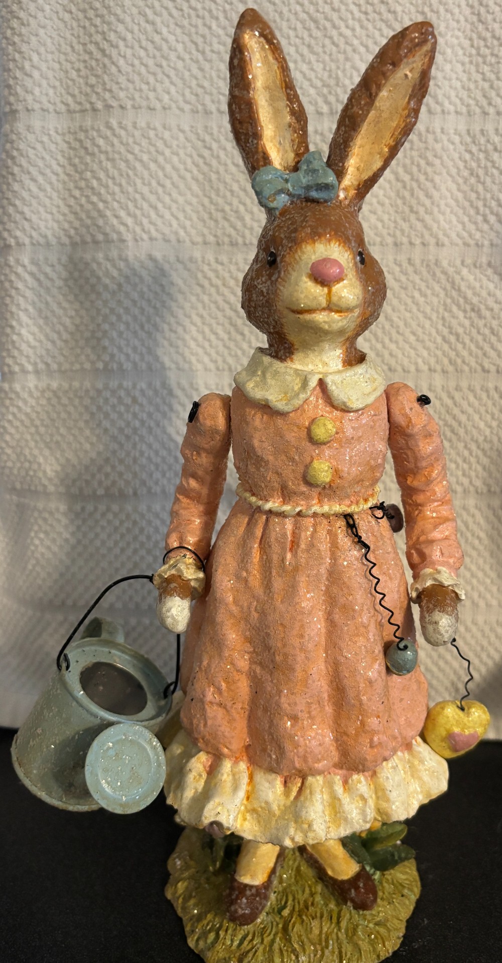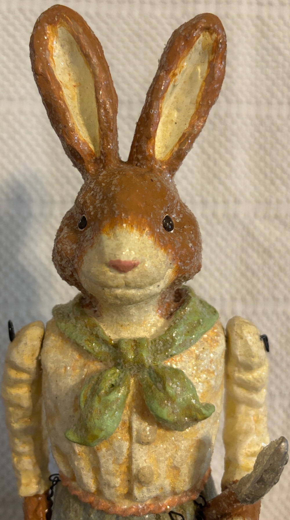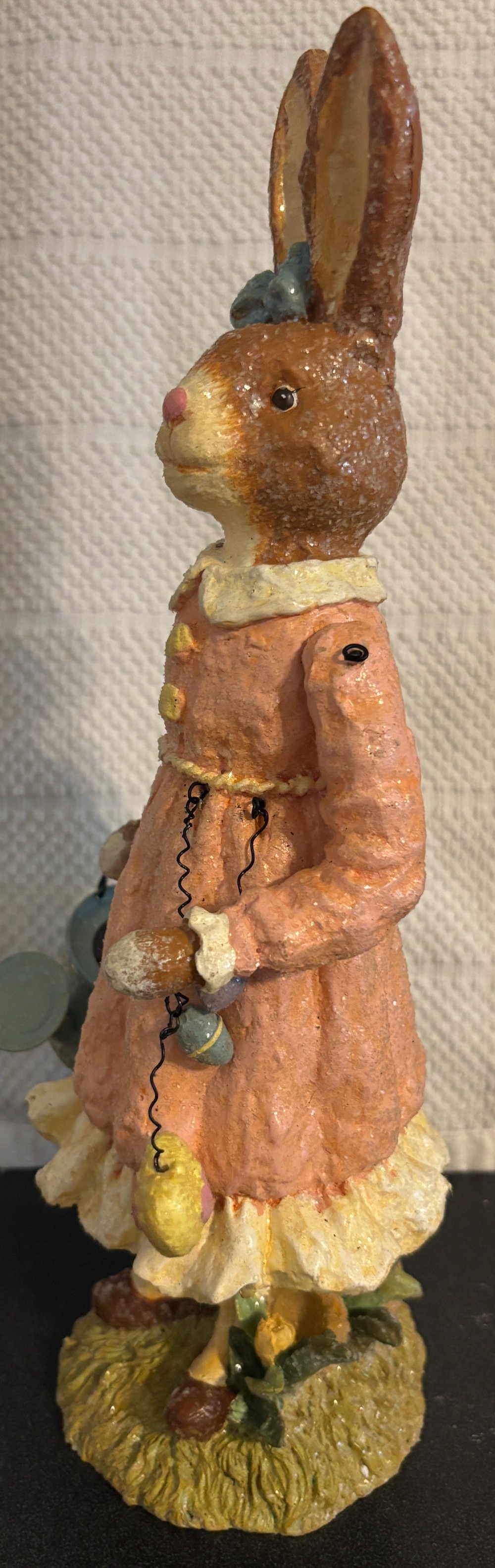 Set of 2 Easter resin with glitter tan and white gardening rabbits with moveable arms 2003, EUC