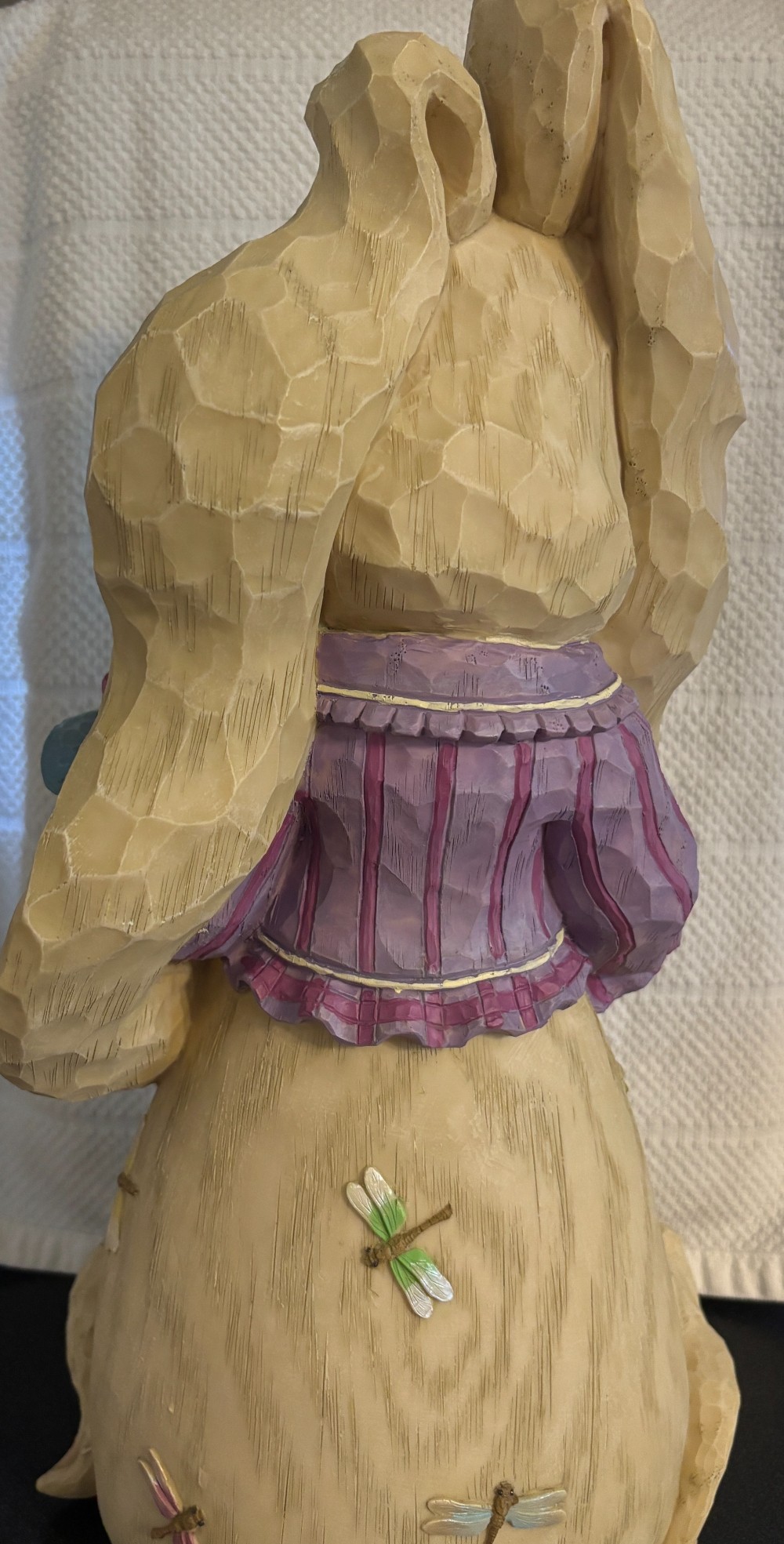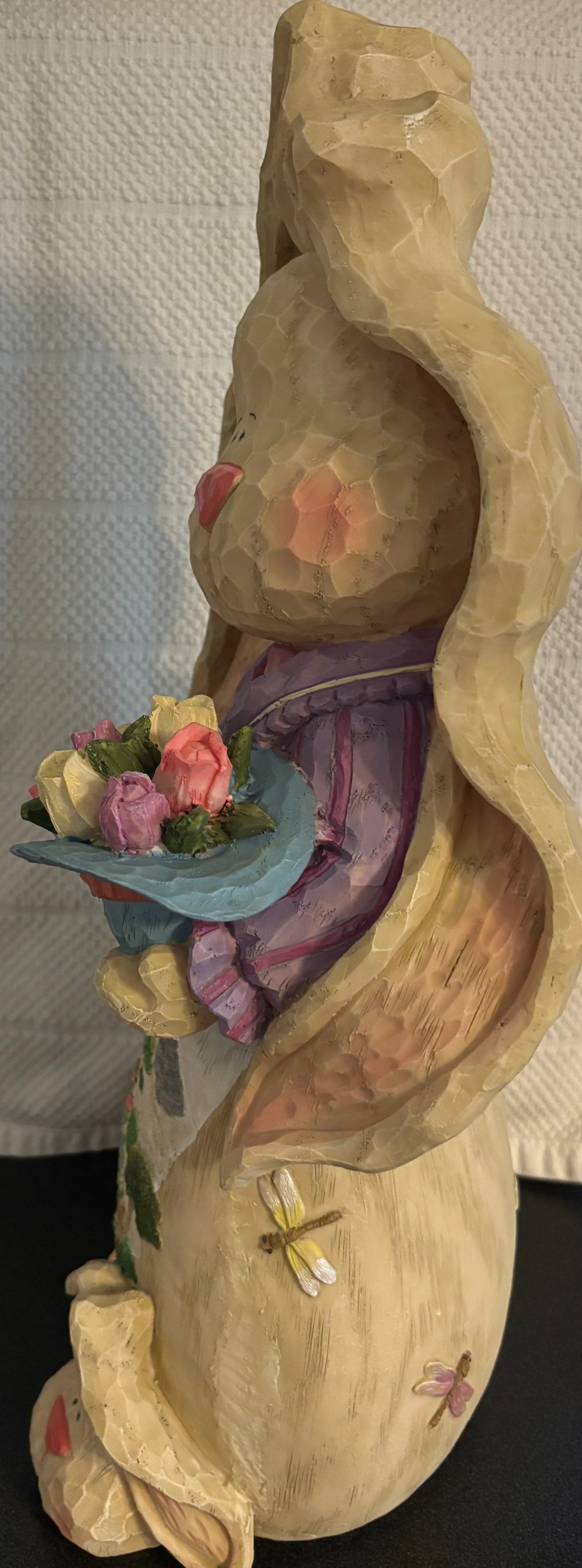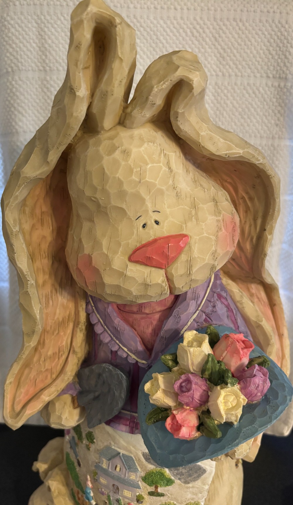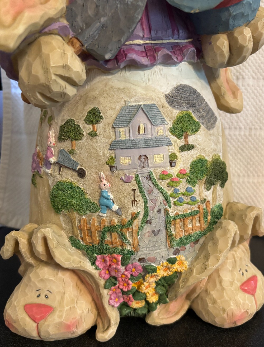 Folk art style resin girl garden bunny wearing bunny slippers and purple jacket. Garden scene on bottom half.