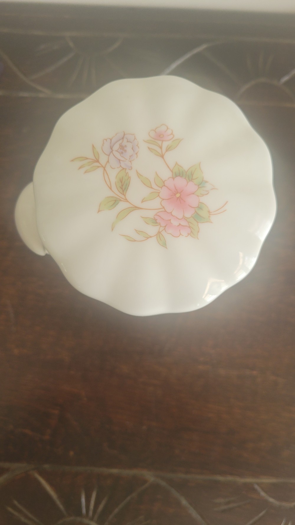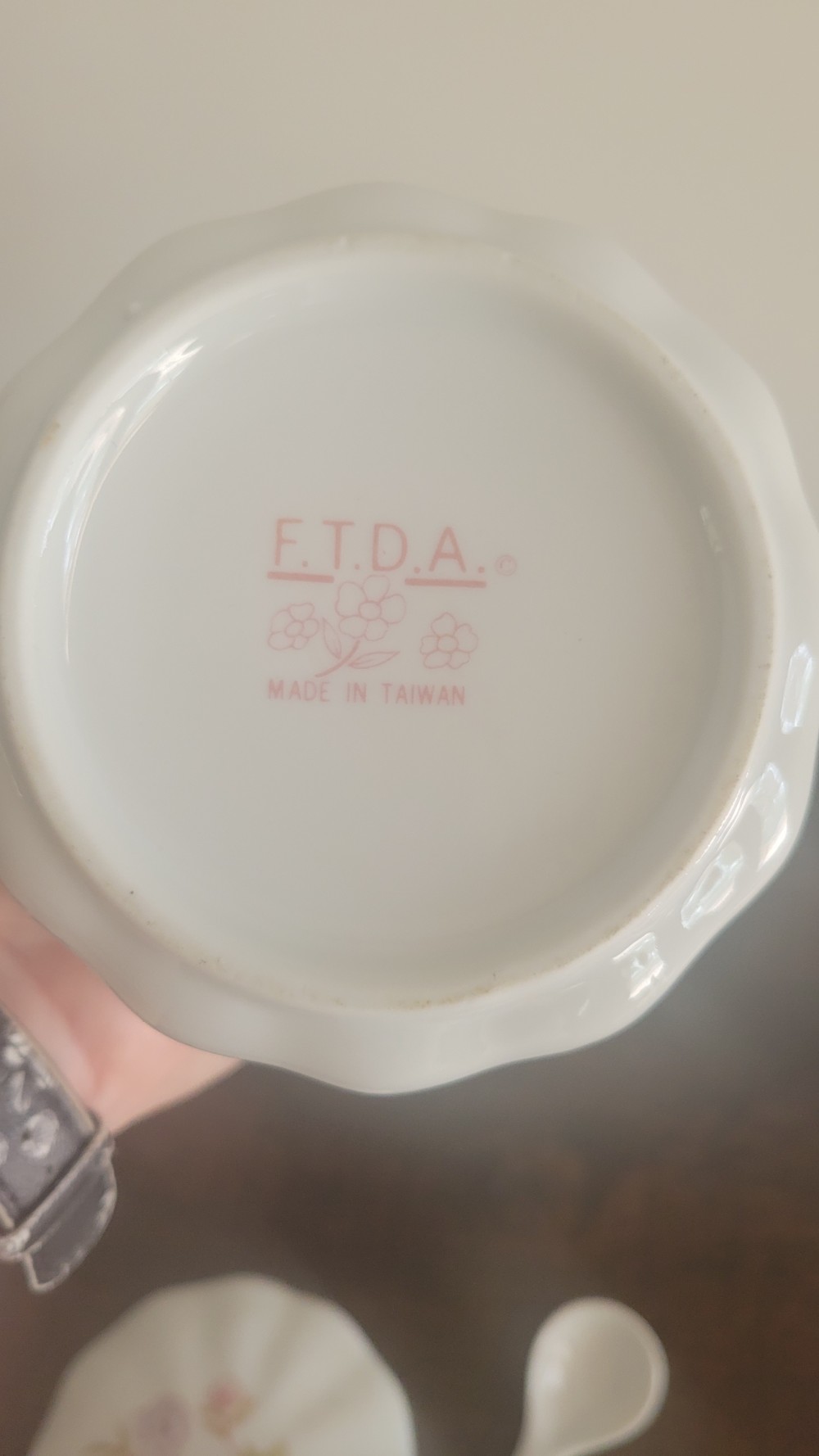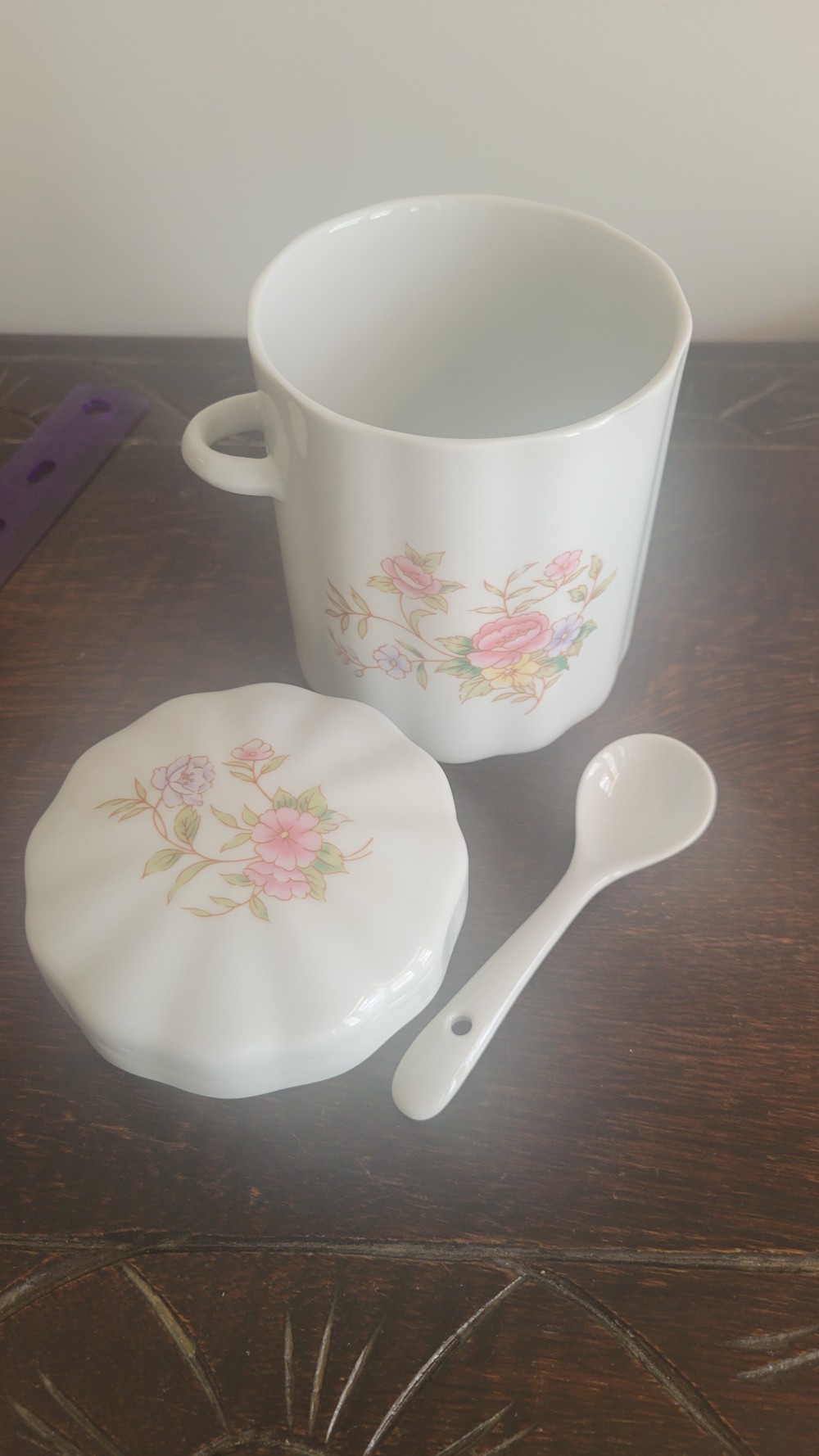 This item is a vintage 1988 FTDA porcelain floral canister featuring a pastel pink, yellow, and purple flower pattern on a white scalloped base. Designed to hold tea, coffee, or sugar.