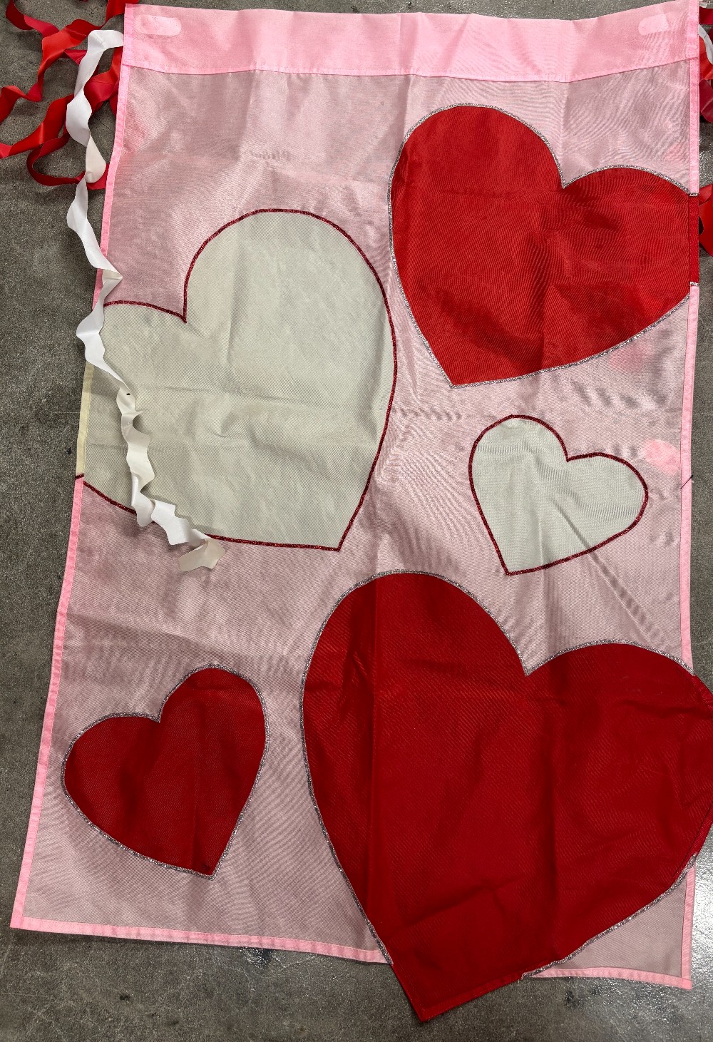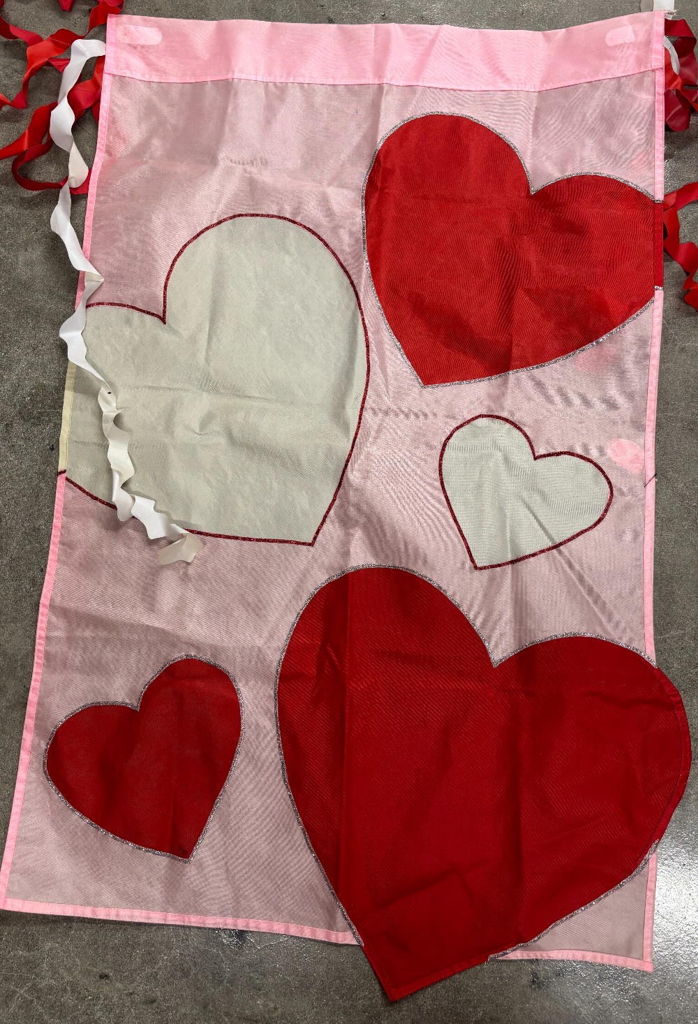 Valentine's Day nylon red white hearts outlined in sparkle trim double sided with streamers flag. Sturdy for outdoor use on a banner pole.