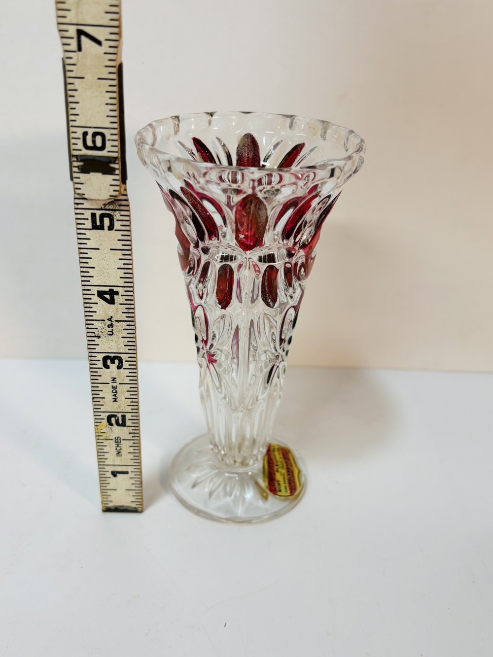 Bohemian/Czech Crystal Cut To Clear Cranberry Bud Vase Flower