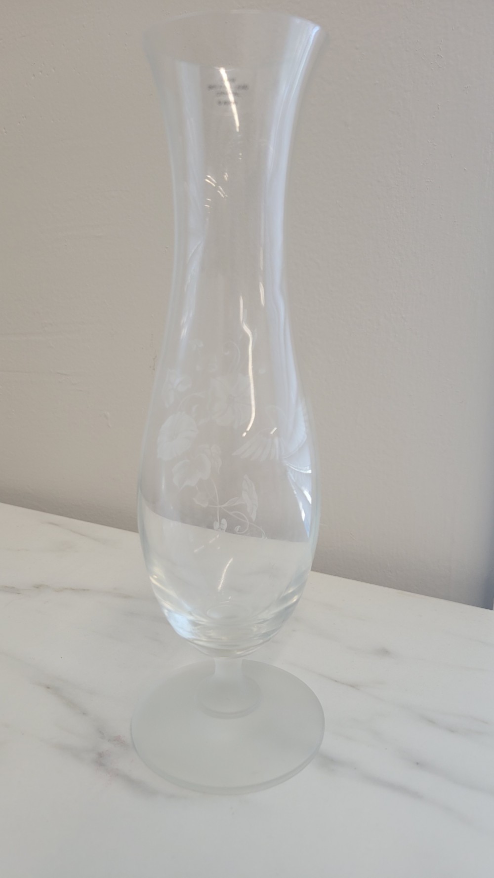 This item is a vintage Avon Hummingbird crystal bud vase, typically etched with a floral design and a hummingbird on a clear glass body with a frosted base. Vase is 24% Lead Crystal.