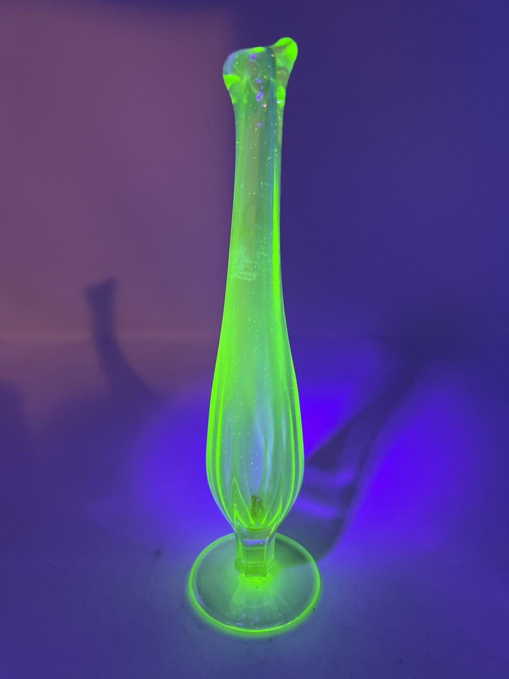 Vintage Uranium Swung Bud Vase; AS IS— some cloudiness and rust.