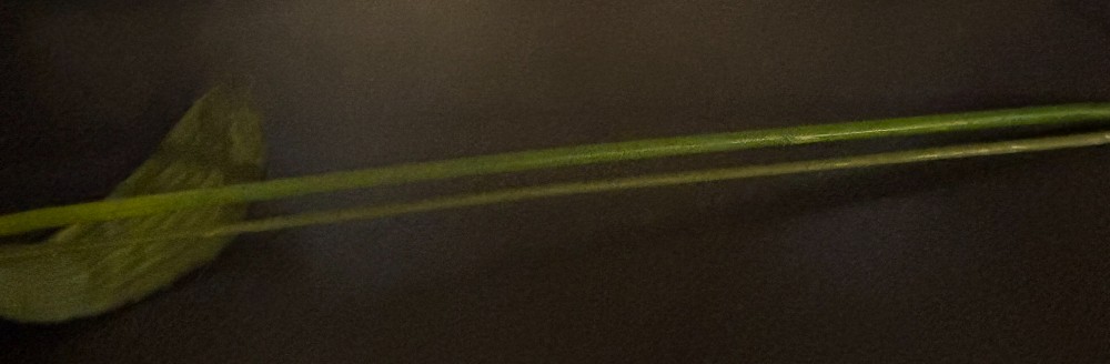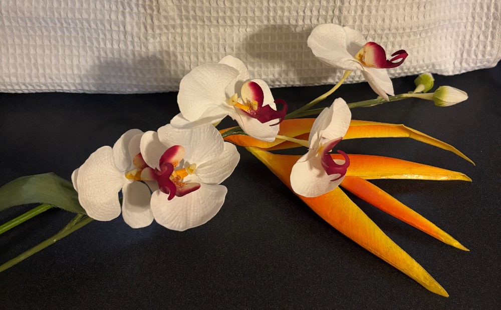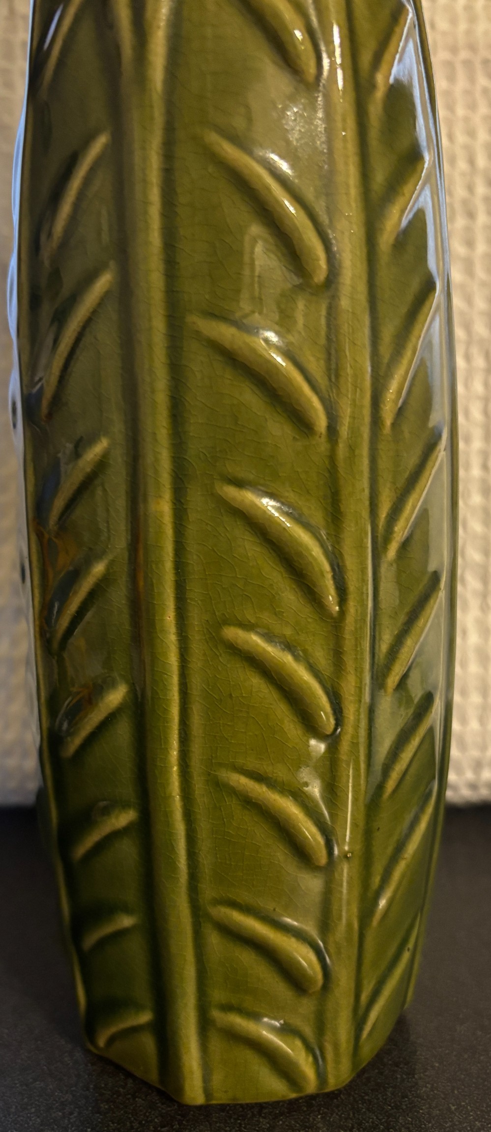 Ceramic olive green leaf design vase with silk orchid and Bird of Paradise.Vase - 15"T x 3"W @ base