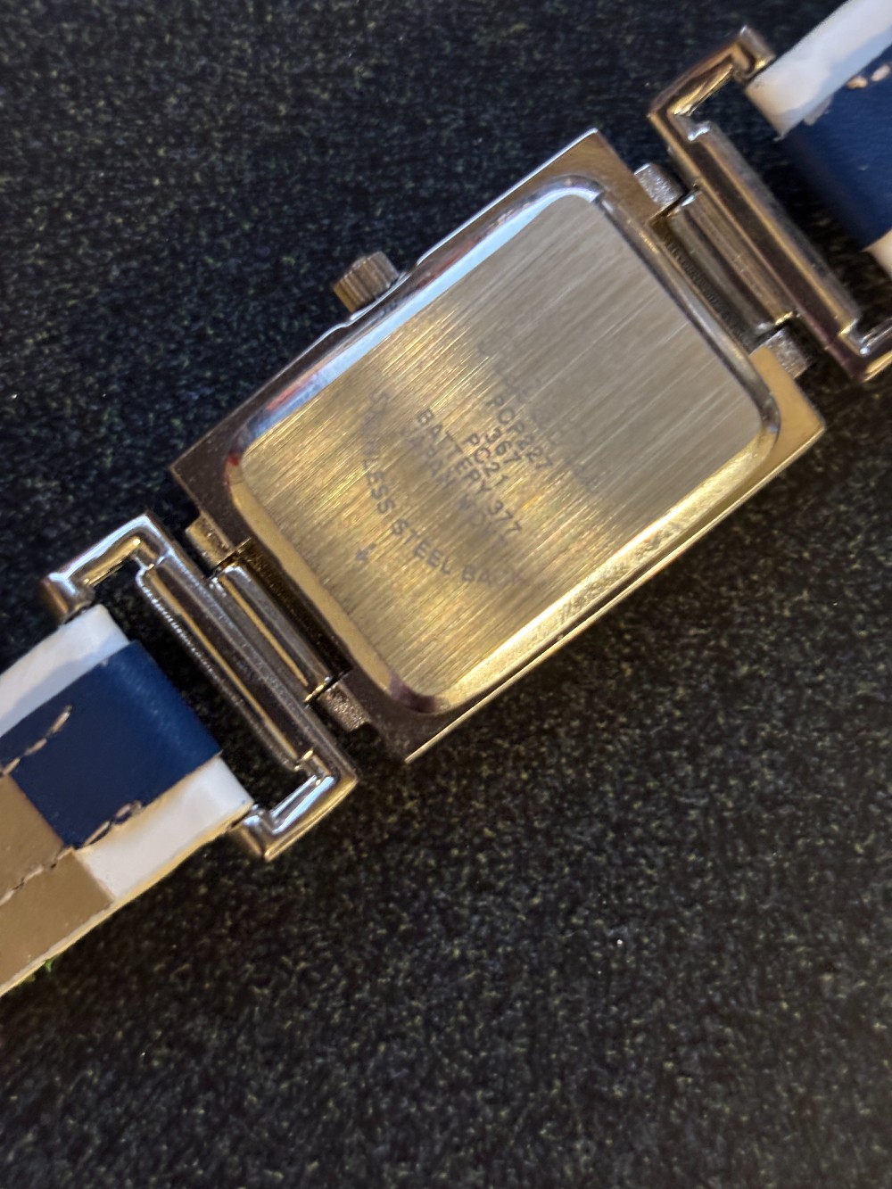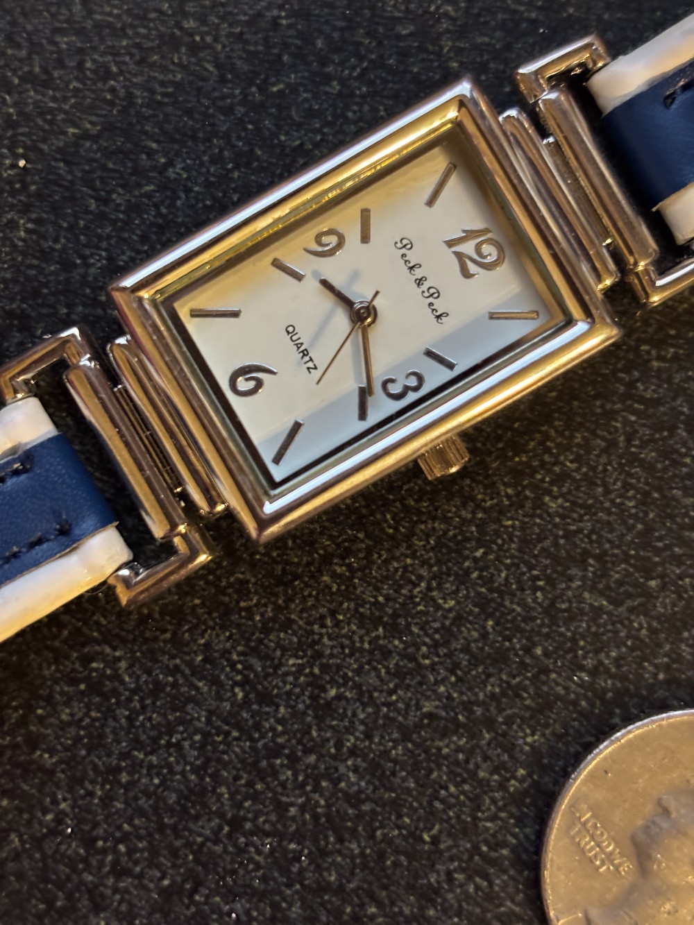 Peck & Peck silver tone watch rectangular face white & navy strap band. Stainless steel back.