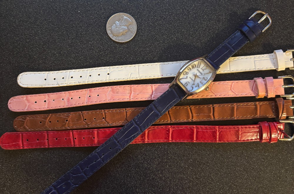 Kessaris silver tone rectangular face w/9 changeable strap bands. Stainless steel back.